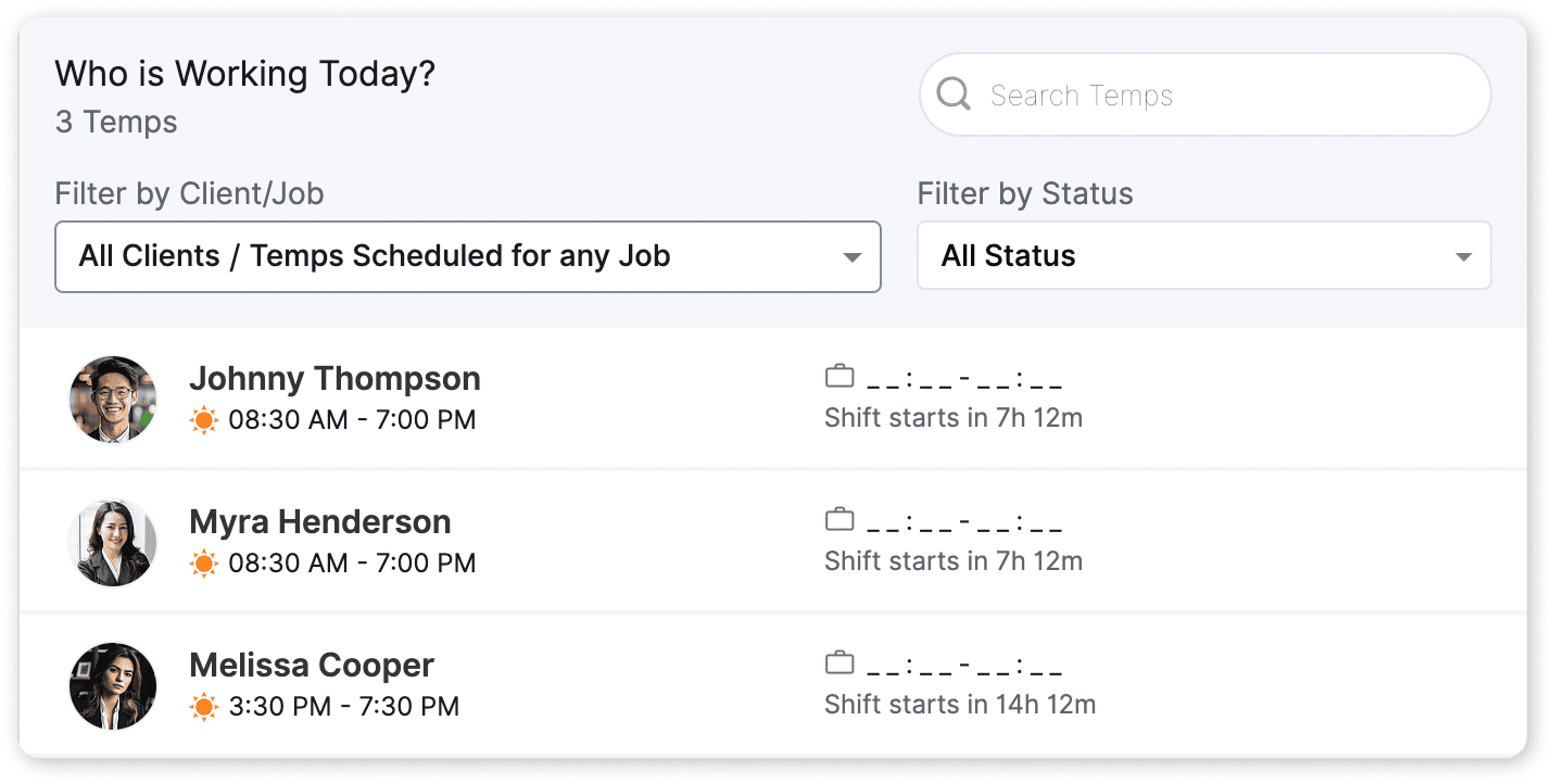 - Solution: With the new filtering options, you can now filter temps based on Client, Job, Shift Status, Current Title, and Temp Name. This allows for quick identification and management of temps.