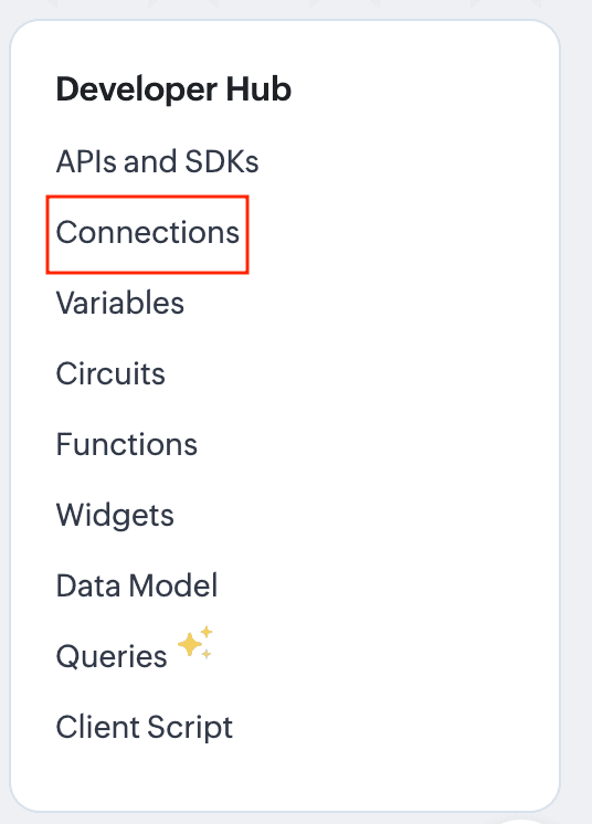 - Navigate to the Connections section of the desired Zoho service. For this example, we'll use Zoho CRM. For Zoho CRM, you can access it under Settings -> Developer Hub -> Connections.