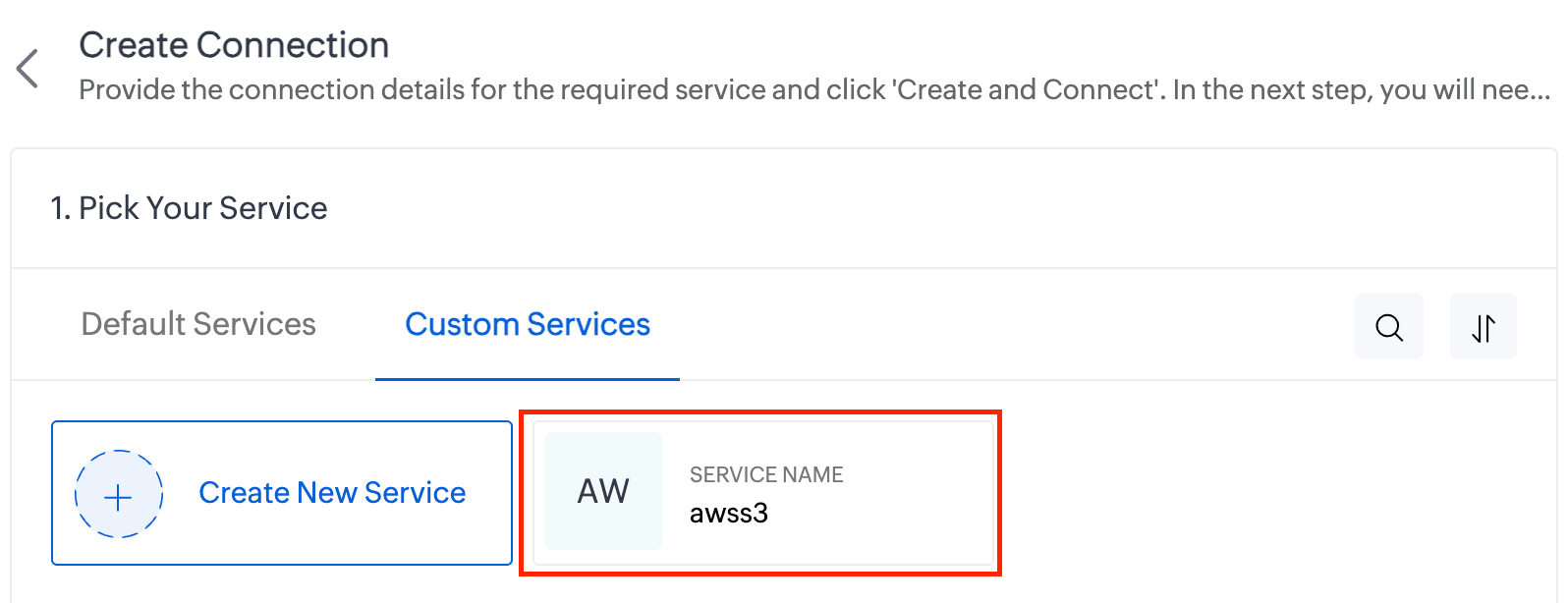- On the Create Connection page, go to Custom Services under Pick Your Service and select awss3.