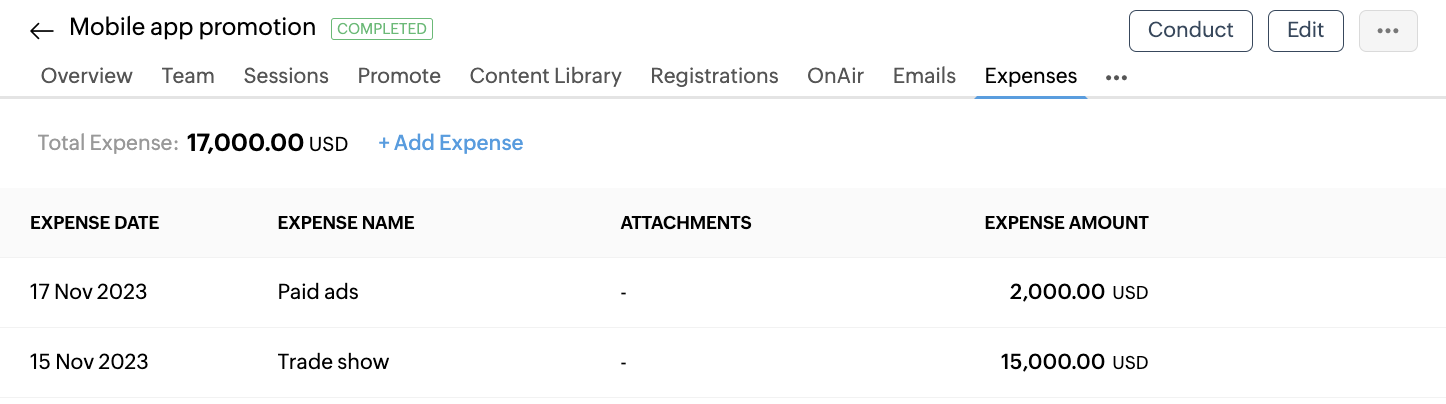 For instance, if the marketing head has allocated a net budget of $50,000 for a mobile app promotion project and the marketing team conducts multiple activities, such as event marketing and running paid advertisements online, the expenses could be added to the system as follows: