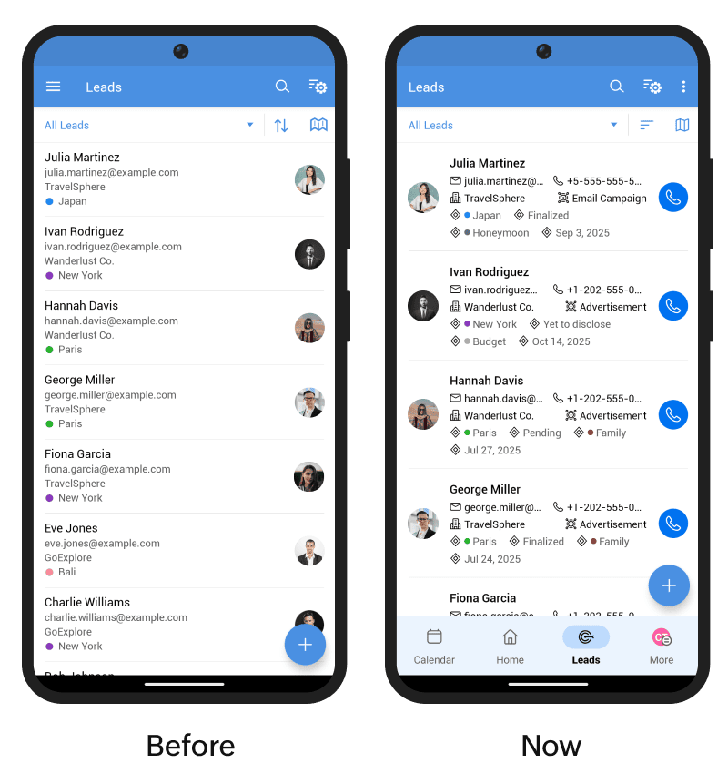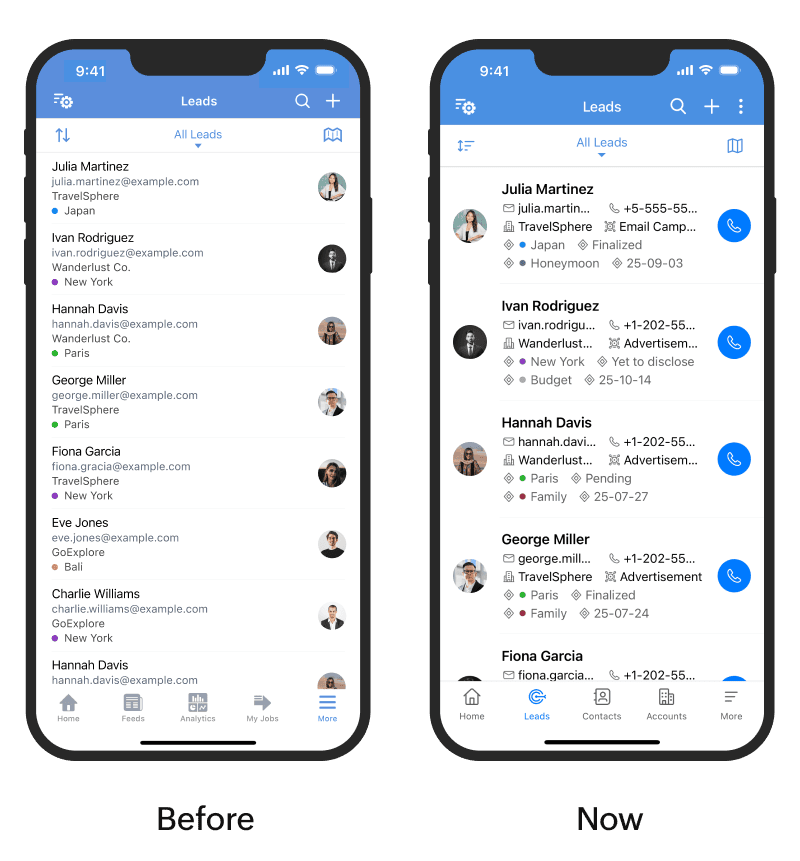 Dynamic Display in Zoho CRM's mobile app lets you choose up to 9 fields to show in your list view so that you see the most important details right away without having to open each record.
