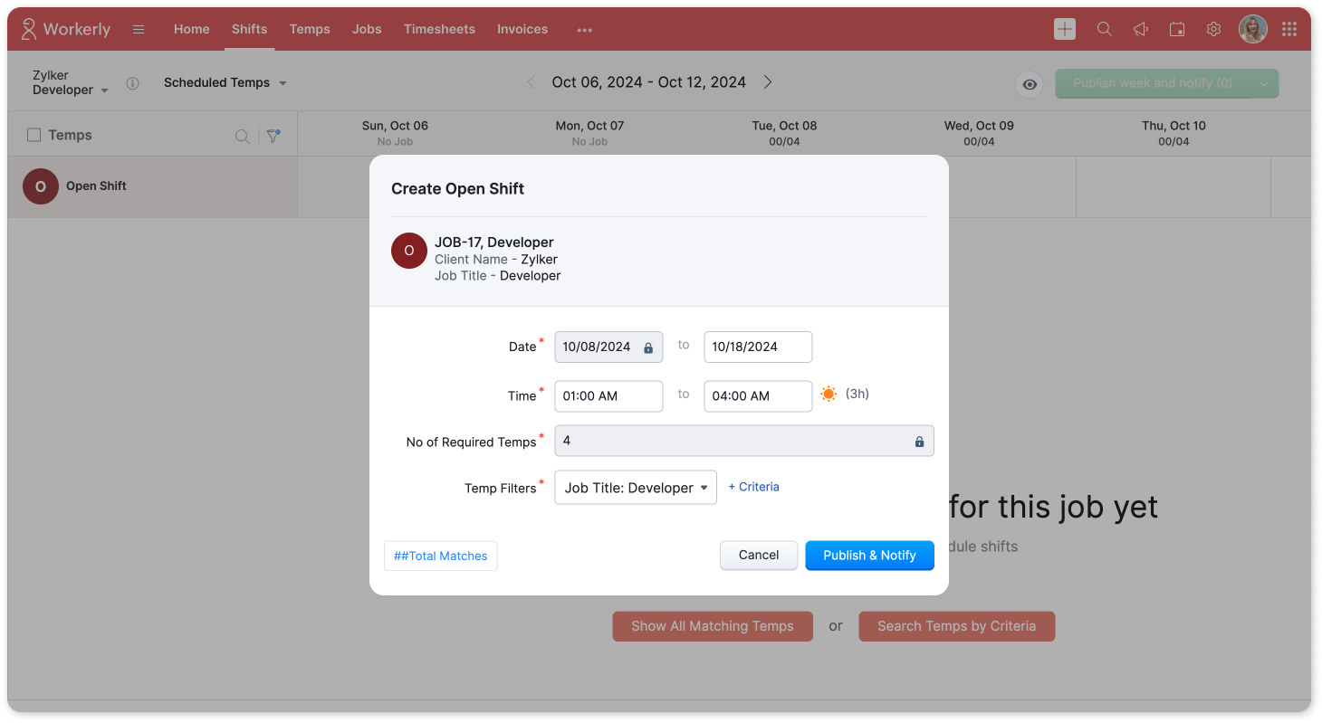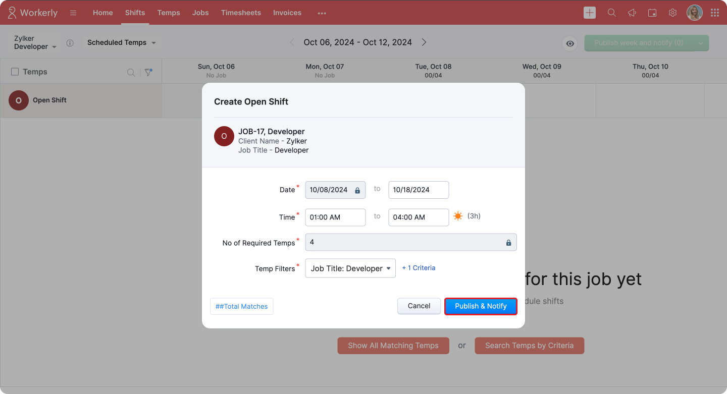 - Click Publish & Notify to finalize and save the Open Shifts.