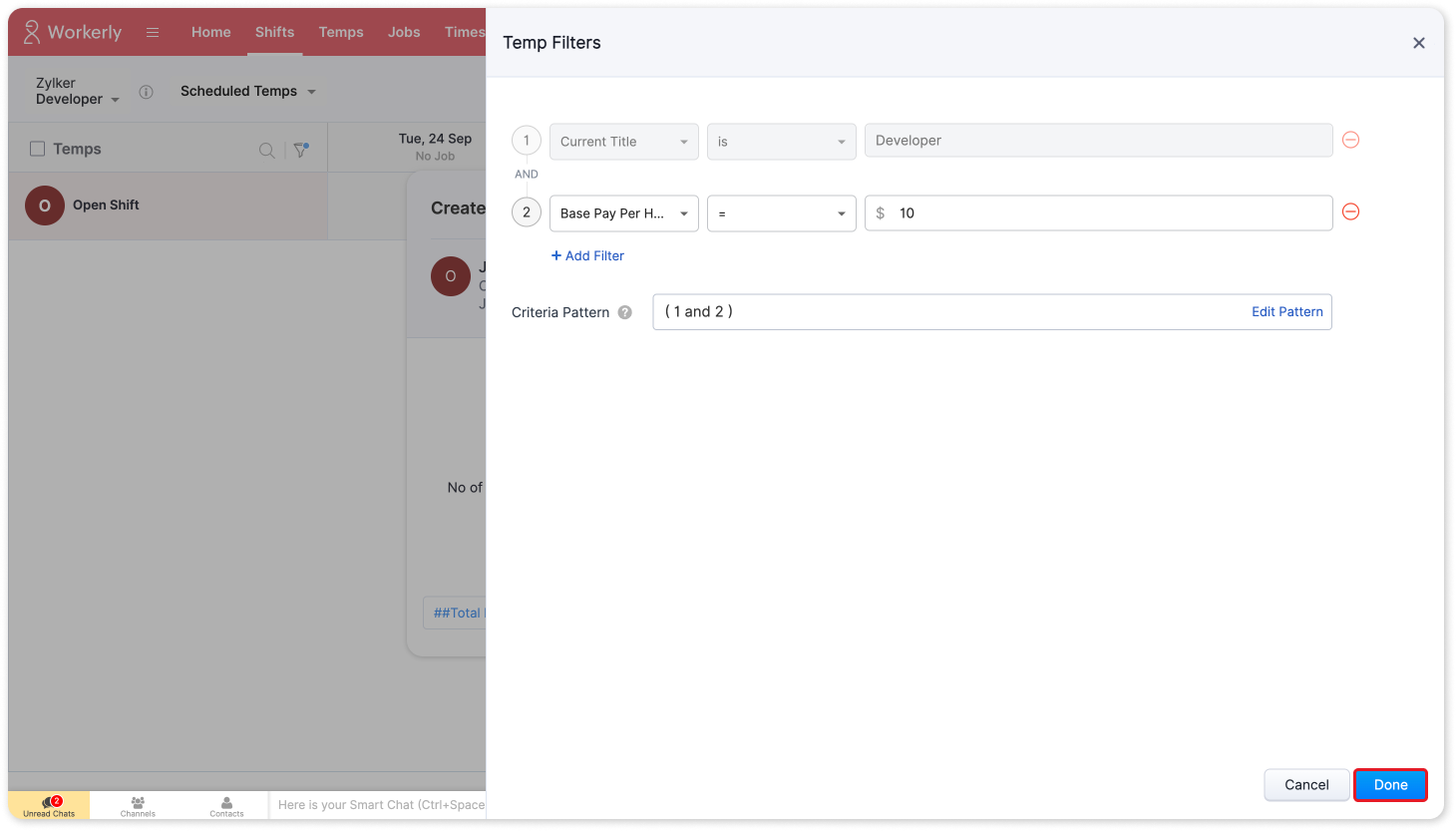 - If required, apply criteria to Temp Filters to narrow down suitable temps, and click Done.