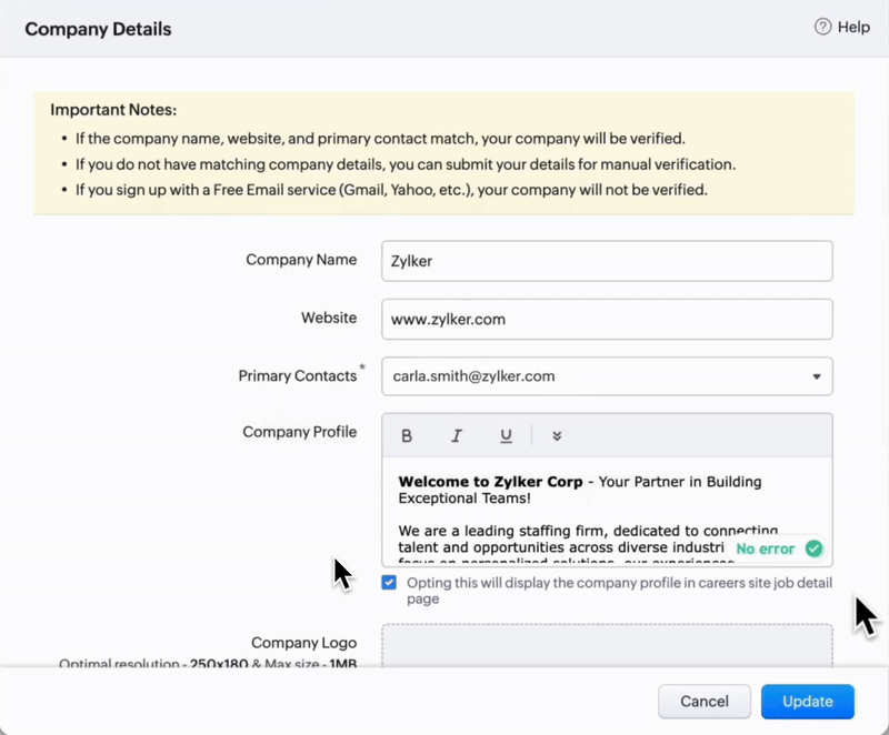 Company profile verification is a process that ensures the legitimacy of your business within Zoho Recruit. This verification helps maintain a secure and trustworthy hiring ecosystem by restricting access to certain features if your profile is unverified. See More Company Profile Verification Why should you care?