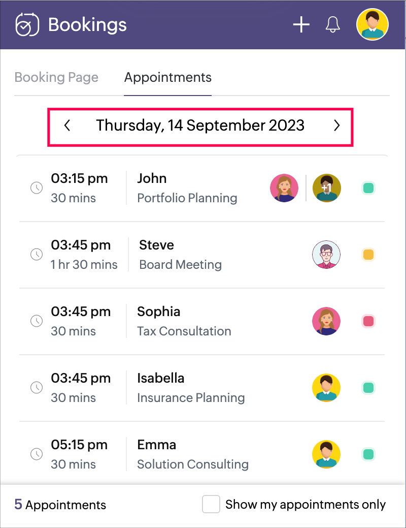 Appointments can be viewed right from any tab of your browser. You can choose any date and see all the appointments of a particular date. In addition to their own appointments, admins can also choose to view all appointments of other staff.