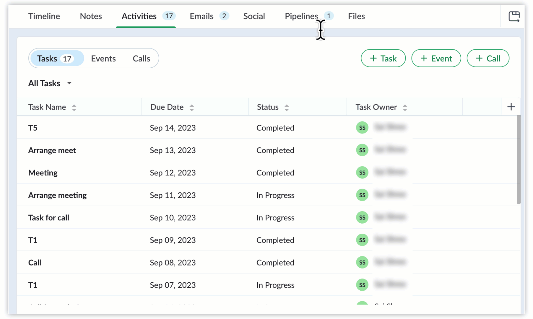 To solve this, starting today we'll be showing record activities in the conventional list view, which will be customizable as well as sortable. Also, we'll be showing each activity type under separate sub-tabs, like Tasks, Events, and Calls, offering you a cleaner view of the information related to each type.