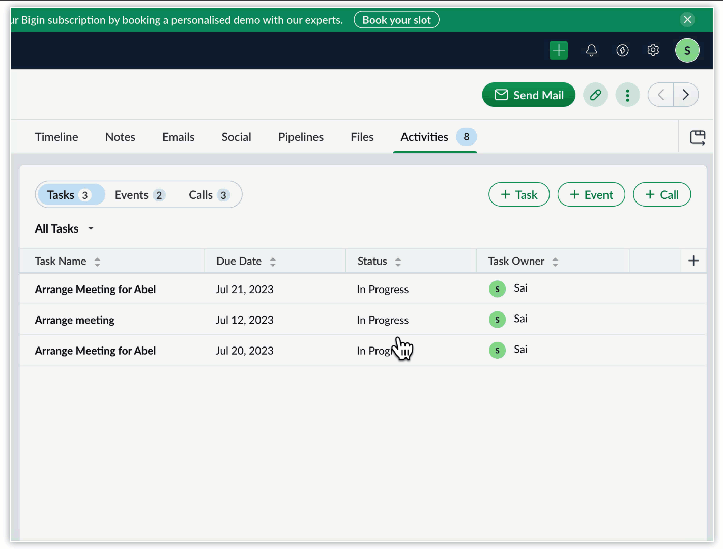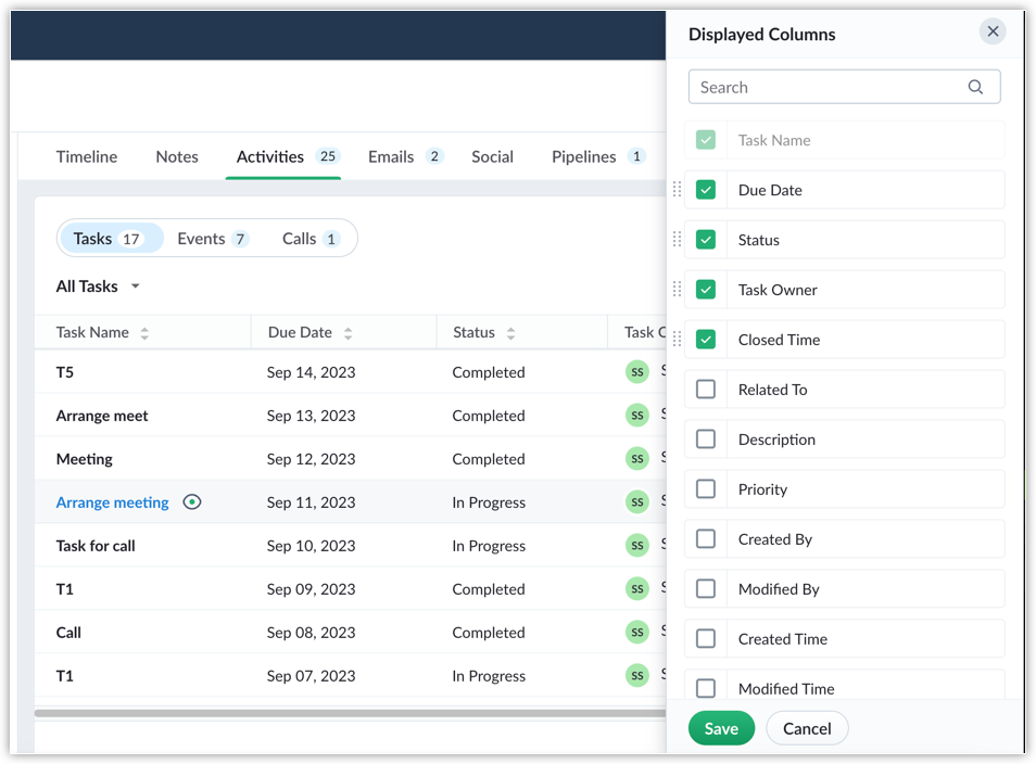 Sorting the list: You can sort the Activities list based on a chosen field. This feature enables you to organize activities by date, priority, or any other relevant field, making it easier to track and manage you tasks, events, and calls.