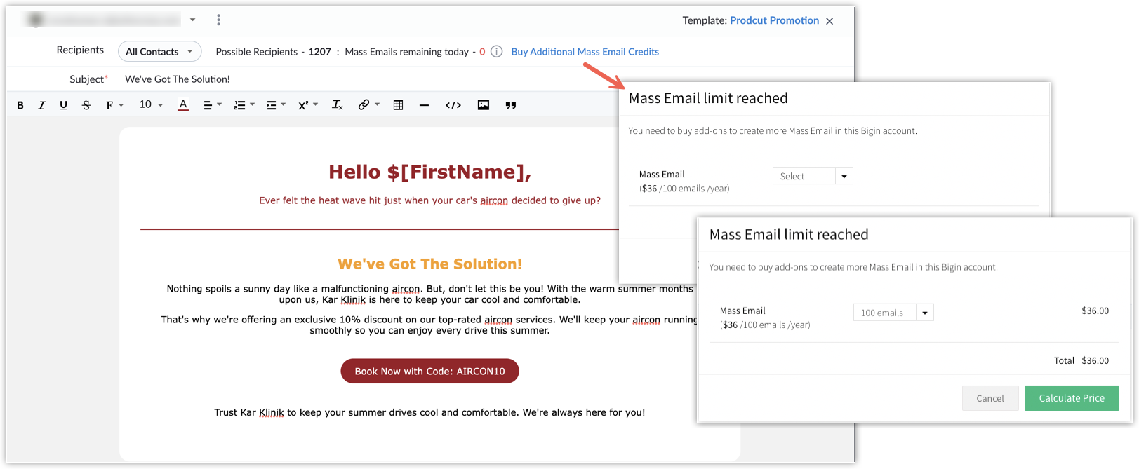 The mass email add-on aims to help your teams and make email marketing easier. It allows you to send more emails to reach more people, nurture potential customers, and provide personalized experiences.
