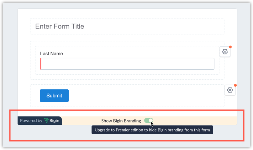 With this update, we'll apply subtle Bigin branding on forms created or updated hereafter. After this enhancement, a "Powered by Bigin" label will be shown at the bottom of each form created using Bigin. Customers under the Premier and Zoho One editions will have an option to hide this Bigin branding from their forms.