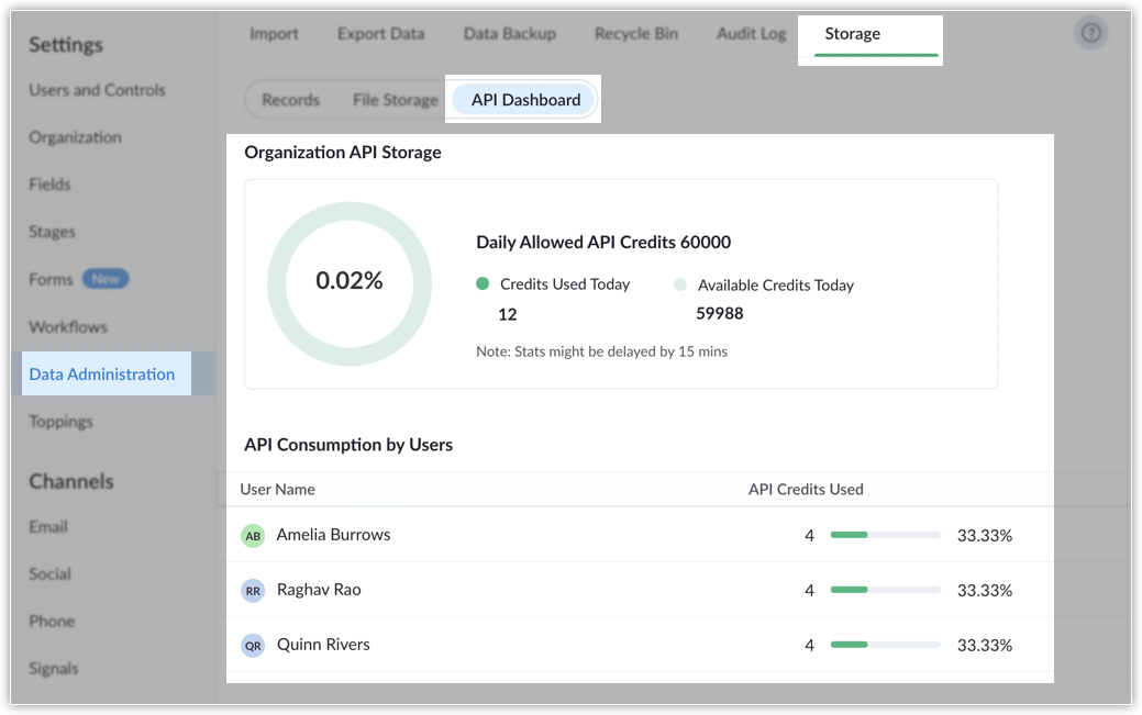 With this enhancement, you can now view the consumption of API credits in your organization within the 24-hour window. The API credits dashboard provides an overview of the total credits available in the organization's account and reports on both used and unused credits, along with each user's API credit consumption.