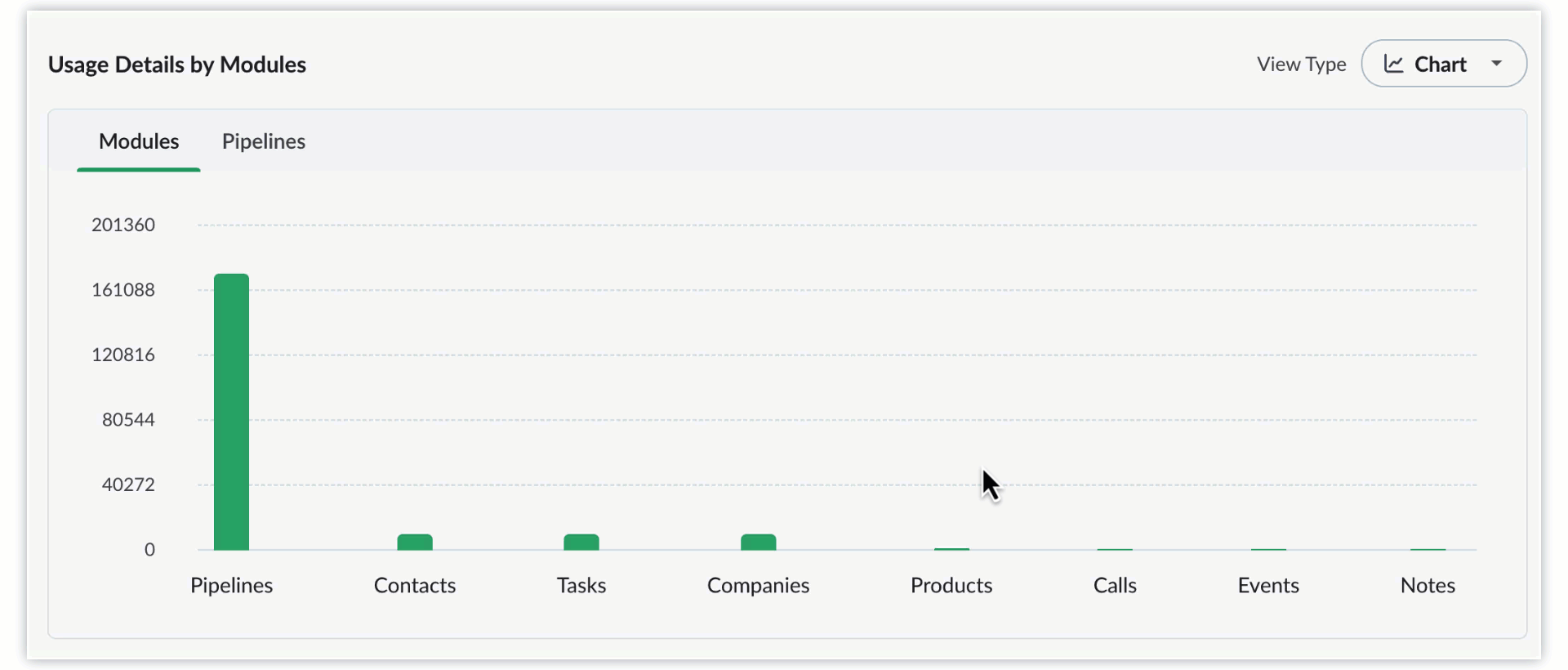 Previously, storage was displayed only as a list view. After this enhancement, you can also view the storage details in a chart format. In this view, the numbers of records in each pipeline, sub-pipeline, and module are displayed in a chart format, which has two different tabs: one for pipelines and one for modules. You can hover over the chart to see the precise numbers.