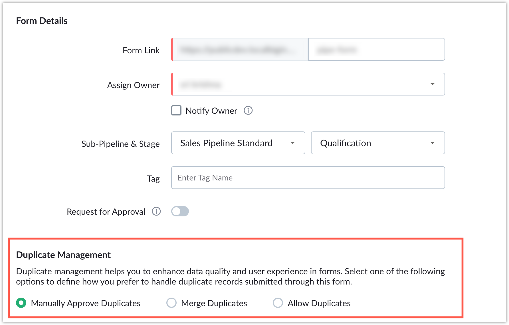 - By default, all existing forms are set to "Manually Approve Duplicates," but you can adjust this setting to suit your preferences at any time.
