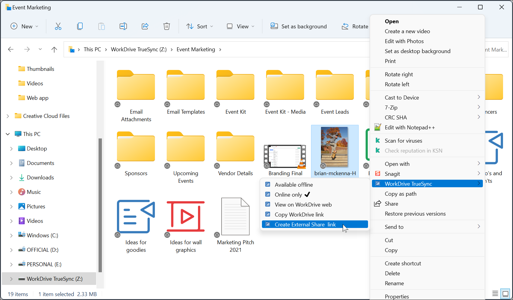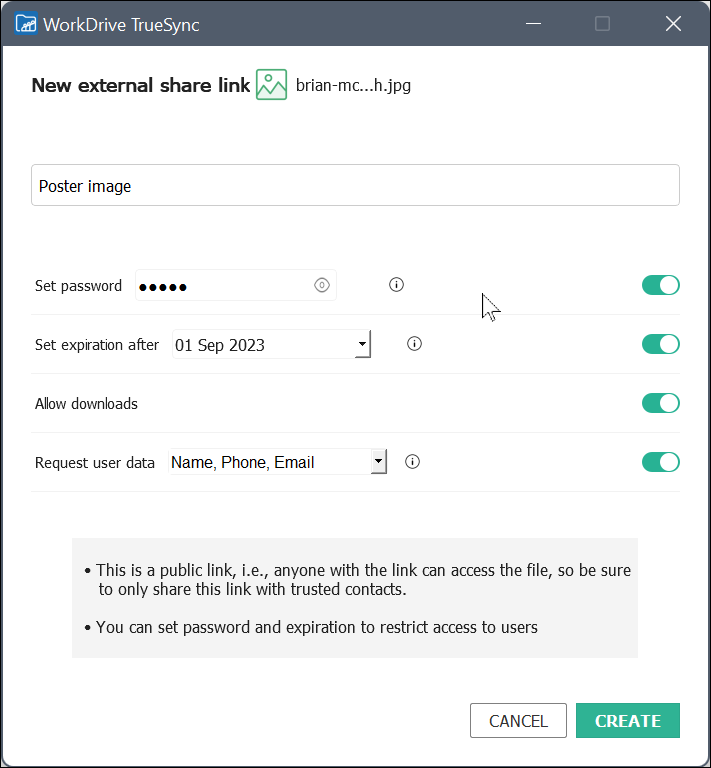 The ability to create external links, and share them with external users, right from your desktop apps is now available in the latest versions of WorkDrive TrueSync and Sync.