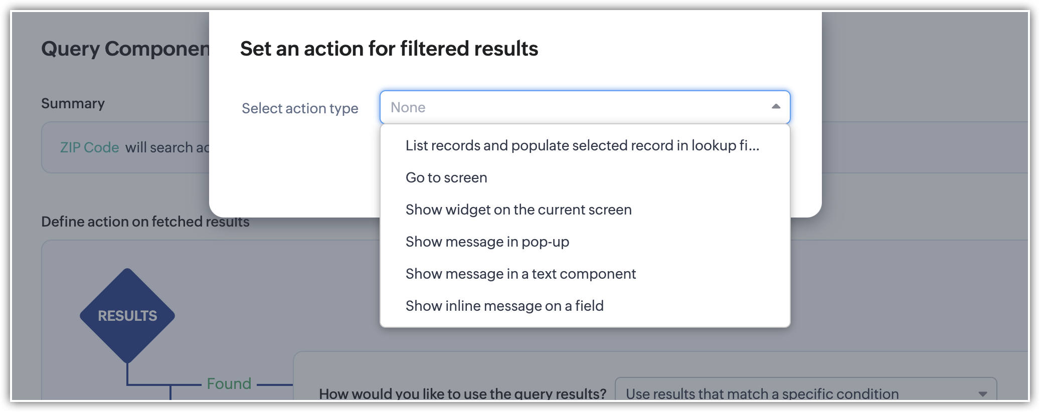 In cases where the search fails to find any matching records, the Query component provides the flexibility to create new records in the current or related modules, in addition to the actions described above.