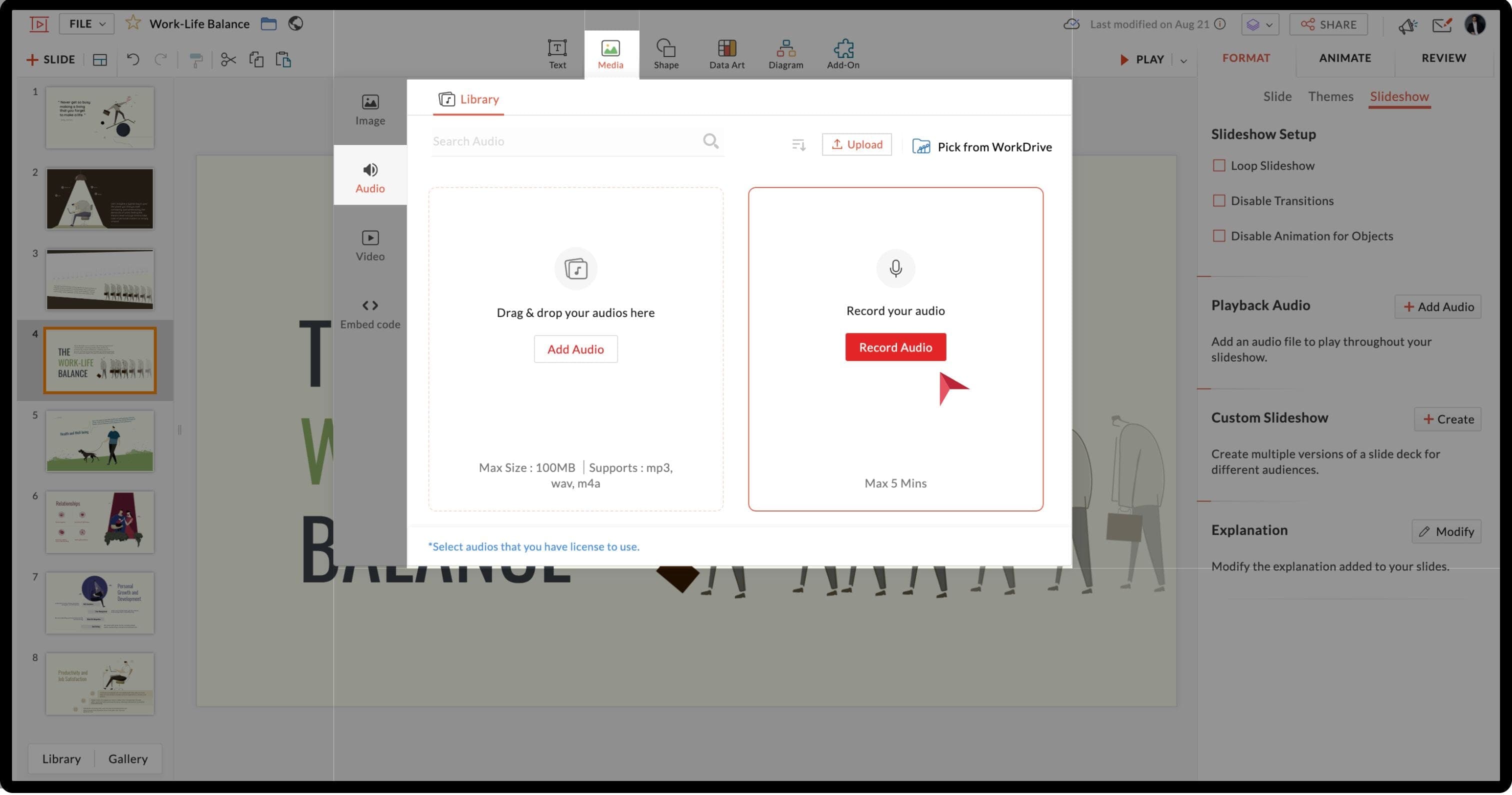 That’s where this feature comes in handy. You can record both audio and video of yourself explaining the content directly in the Show interface. This saves the time you would otherwise spend navigating between the recording and the presentation software, making your content even more effective.