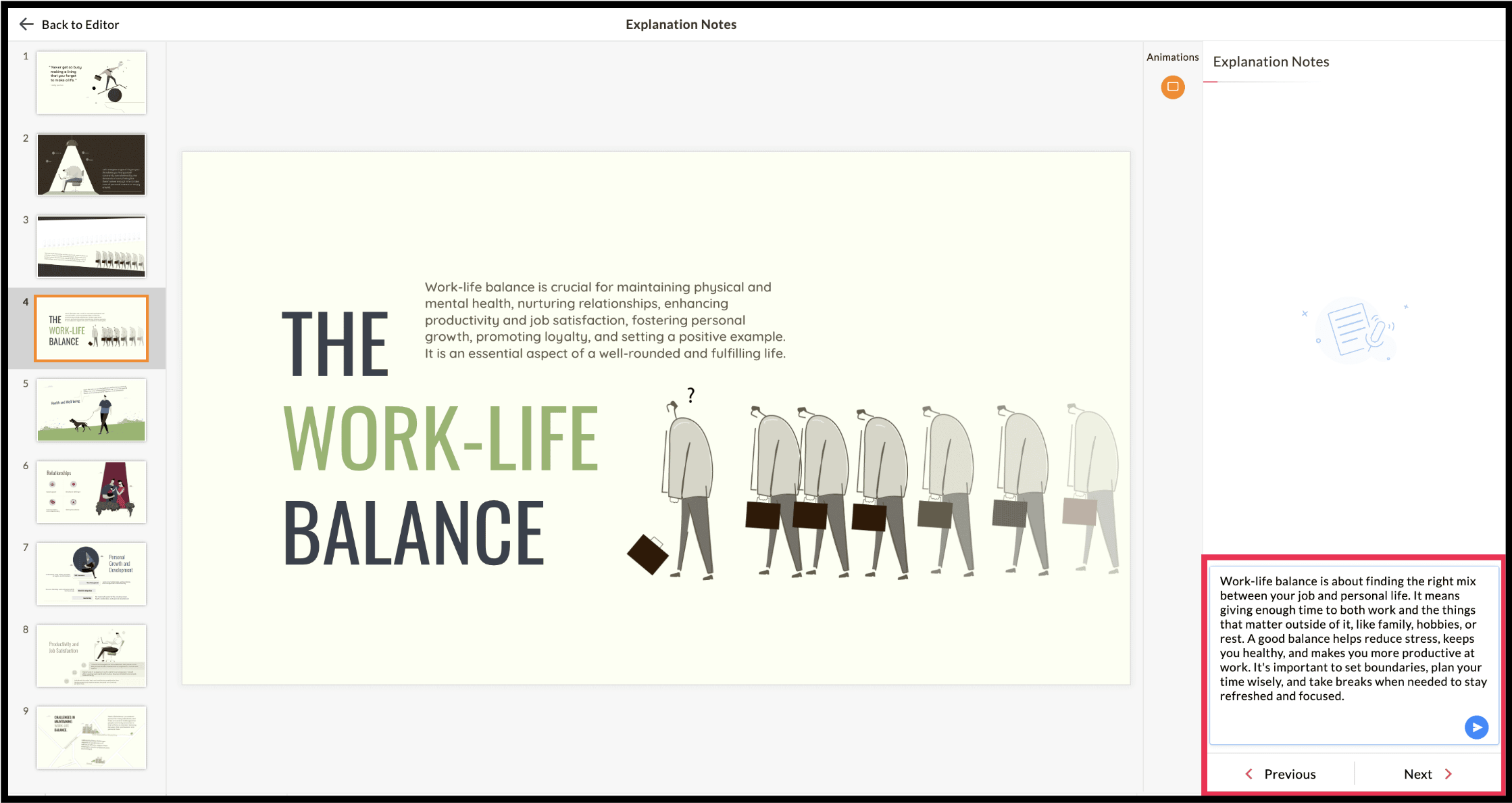 Once you're done adding explanations to all the necessary slides, click Back to Editor in the top-left corner to return to the editor view. Your changes will be saved automatically.