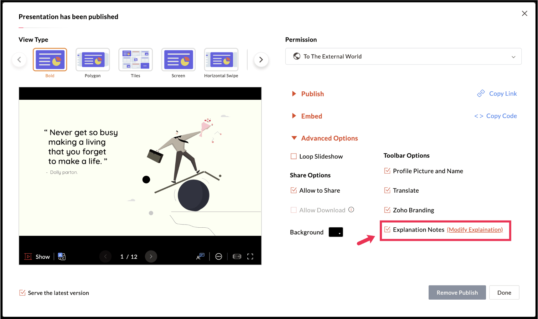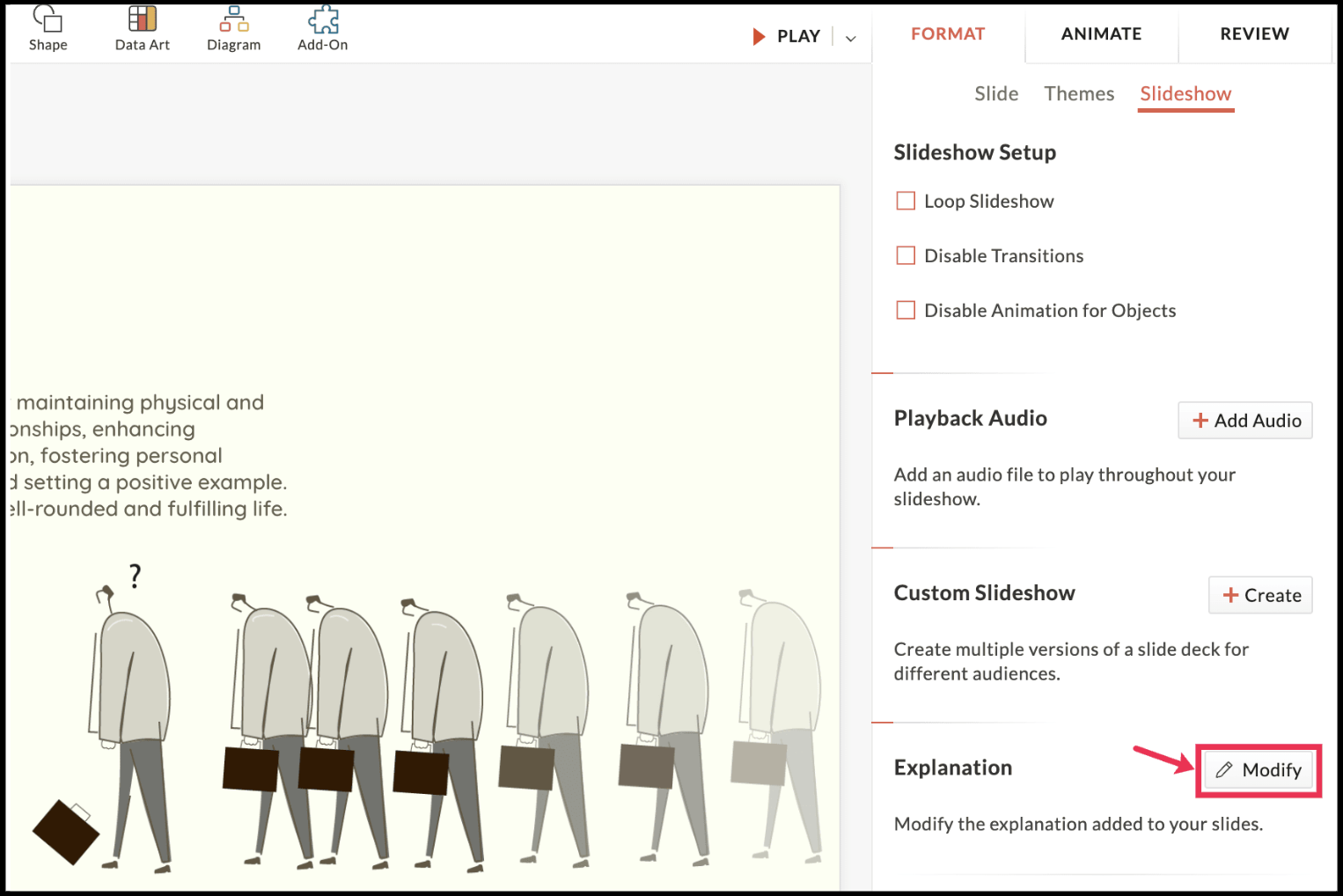 To modify an explanation, go to the Format tab in the right pane, click on Slideshow, and choose Modify in the Explanation section.