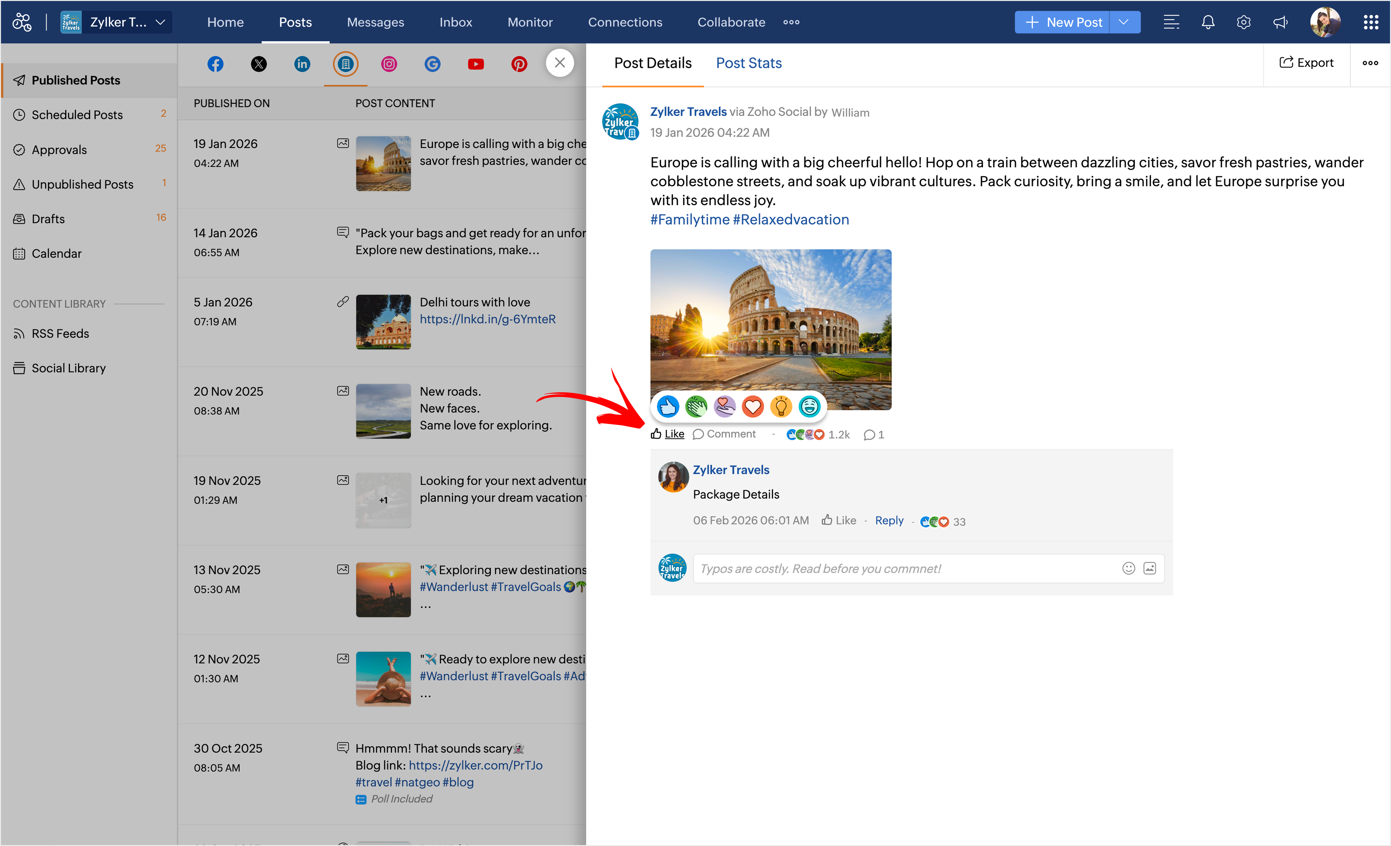 For Facebook, you can see reactions on both posts and comments. For LinkedIn, you can view reactions and also react to posts and comments directly from Zoho Social.