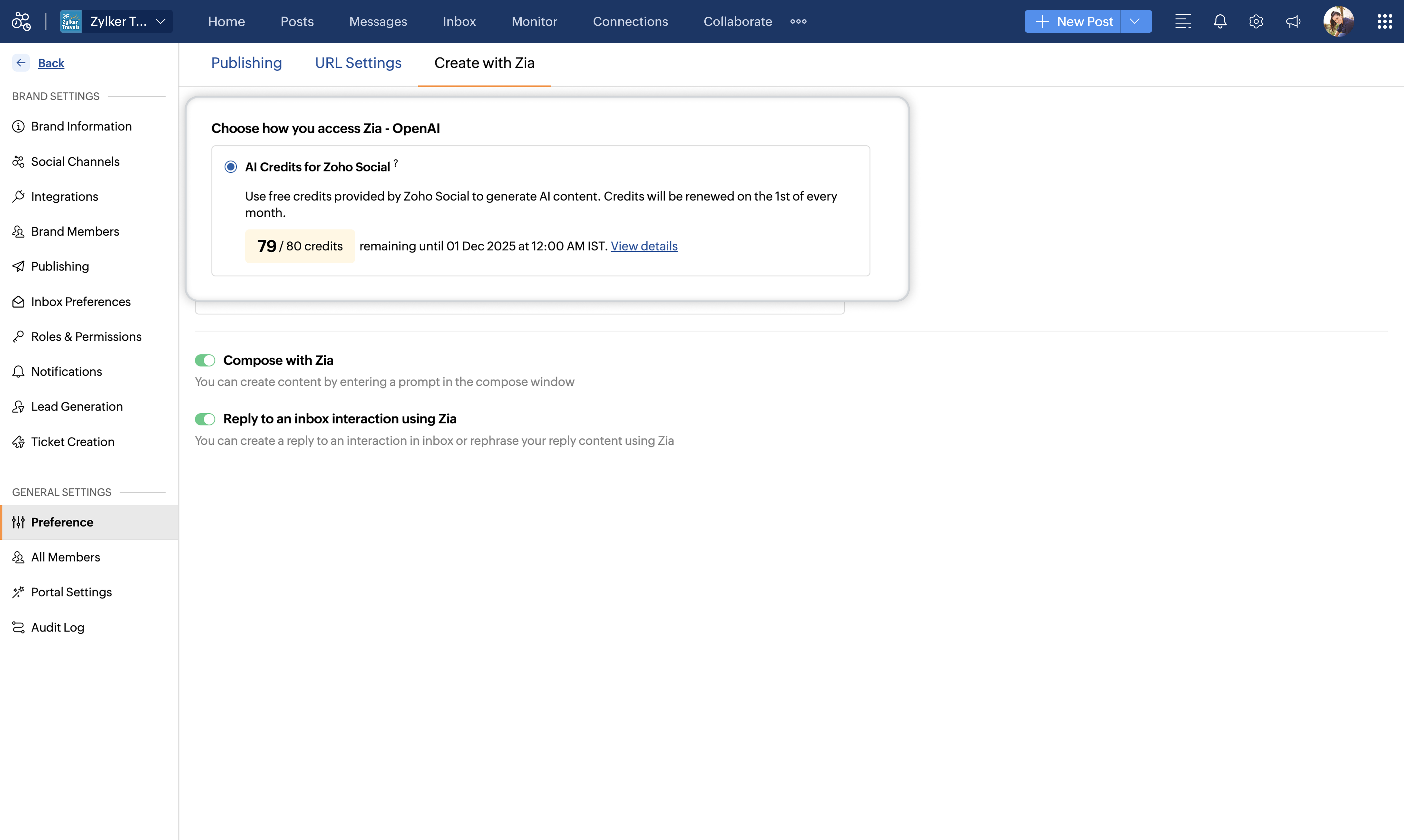 To simplify Zia's use in Zoho Social, we're introducing AI credits, a credit-based model that's included as part of your current subscription at no extra cost. Each time you use a Zia feature, a specific number of credits will be deducted. Your credits will automatically reset at the beginning of each month, ensuring you always have what you need. This helps you stay consistent, personalize your content, and manage your social media presence more efficiently with the power of GenAI.