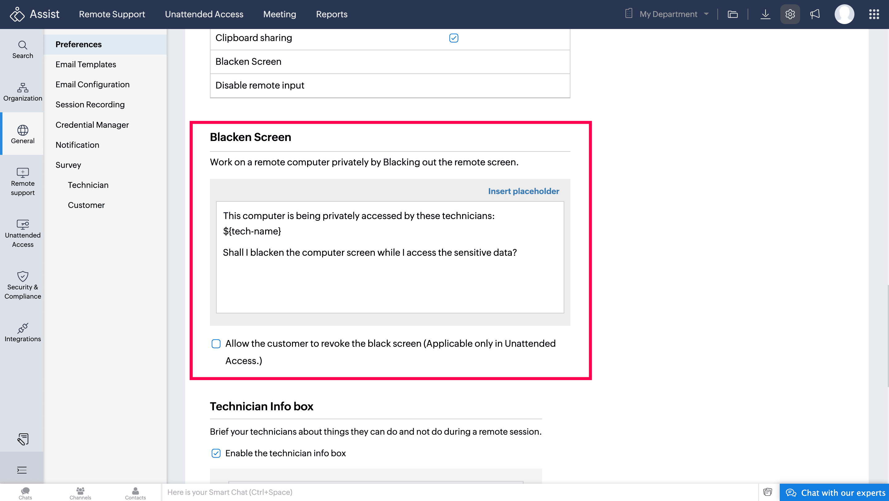To implement this setting, navigate to Preferences in your Zoho Assist account and scroll down to Blacken Screen. Here, you can enable or disable the black screen prompt and customize the message to be displayed on the user's screen.