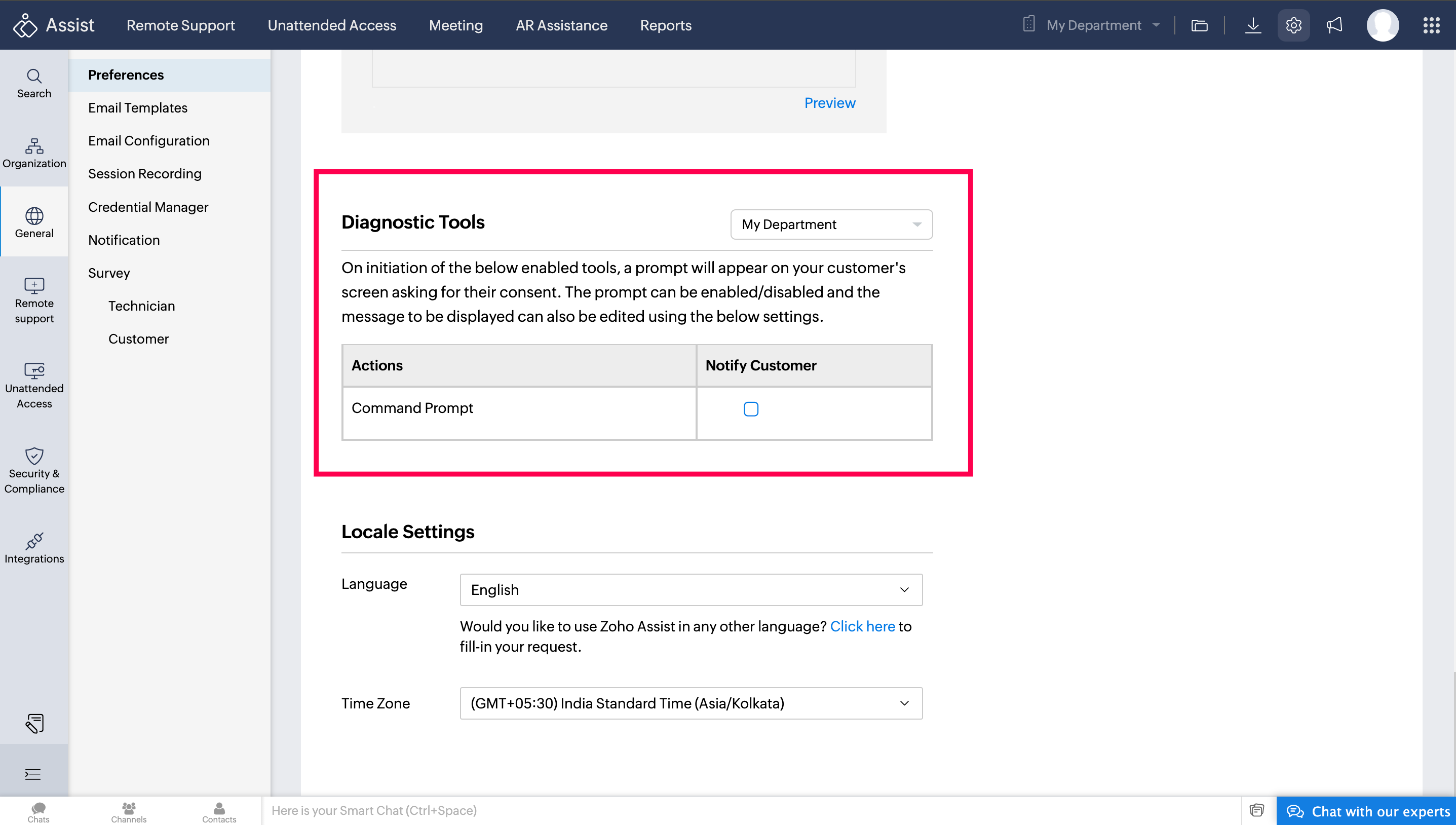 To implement this setting, navigate to Preferences in your Zoho Assist account and scroll down to Diagnostic Tools. Here, you can enable or disable the action and customize the message to be displayed.