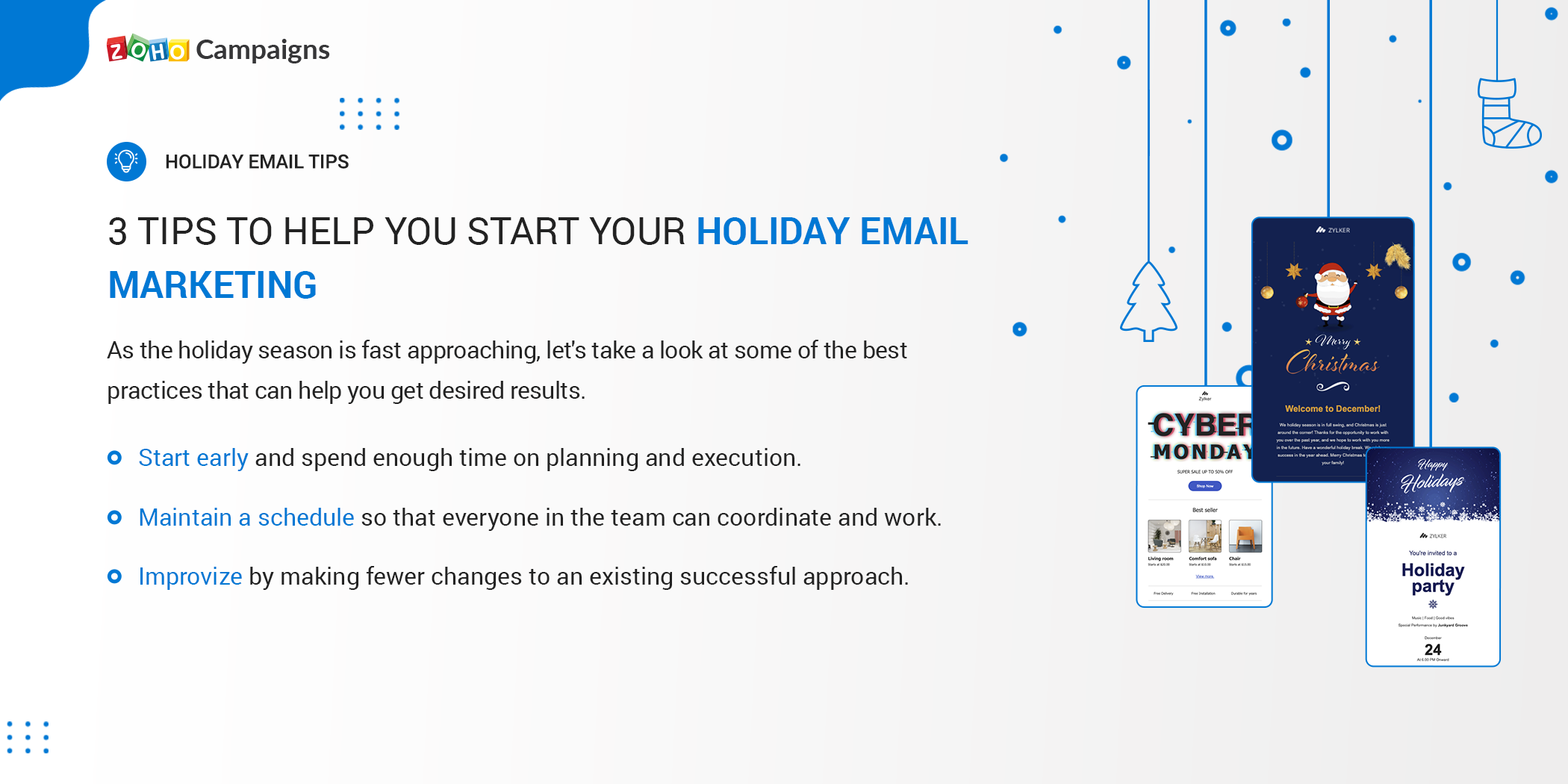 Most of the places around the world get into holiday excitement from early November. Festivals such as Diwali, Hanukkah, and Black Friday take up this part of the calendar. As an email marketer you should begin early and start sending out campaigns from the beginning of October. This will provide a month's time for your holiday email campaigns to work well among contacts. Let your contacts be aware of your discounts and have enough time to make the right decisions.