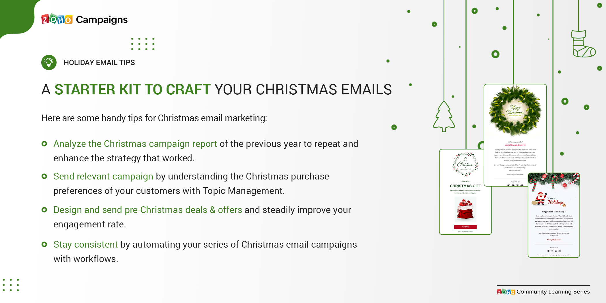 The type of Christmas Campaign that a customer wants to receive will vary from one person to another. Some might want to receive a special holiday season edition of the newsletter; others may just want to receive information about the latest deals and offers. So, such diversity in preferences should be taken care of while designing your Christmas email campaign.