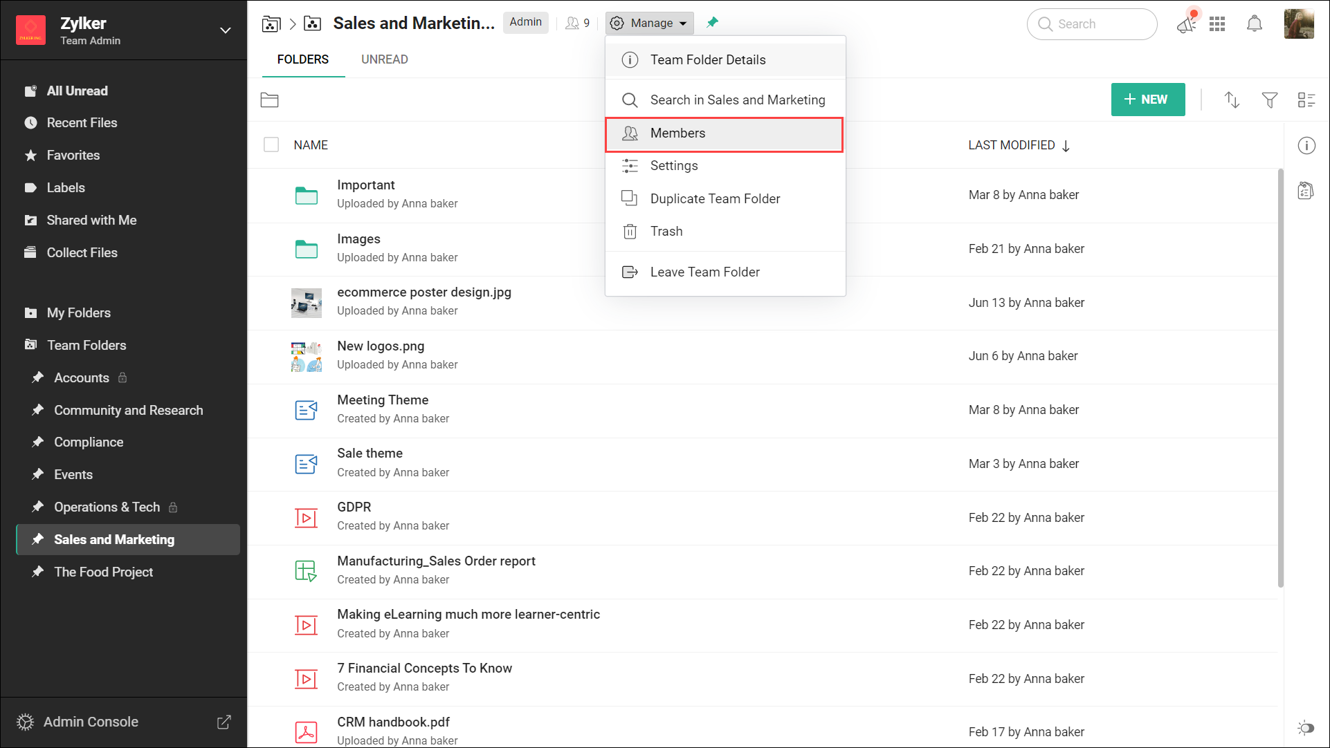 Let's say one of your Team Folder members with the Editor role goes on vacation. You decide that a member with the Viewer role should cover for them. In WorkDrive, you can change your team members' roles at any time during a project, making it easy to delegate work and manage assignments.