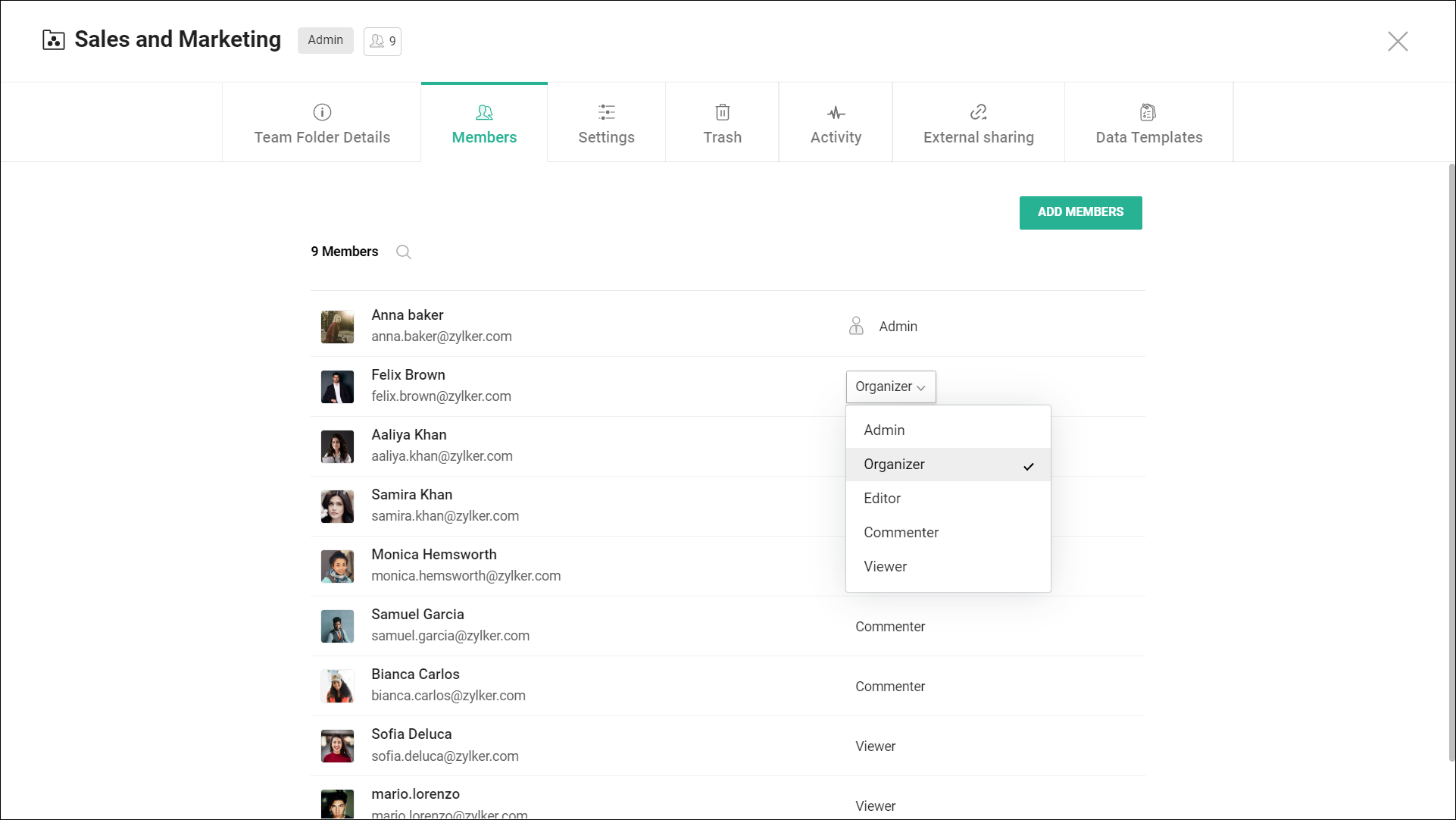 Note: Only Admins and Organizers can change members' roles in a Team Folder.