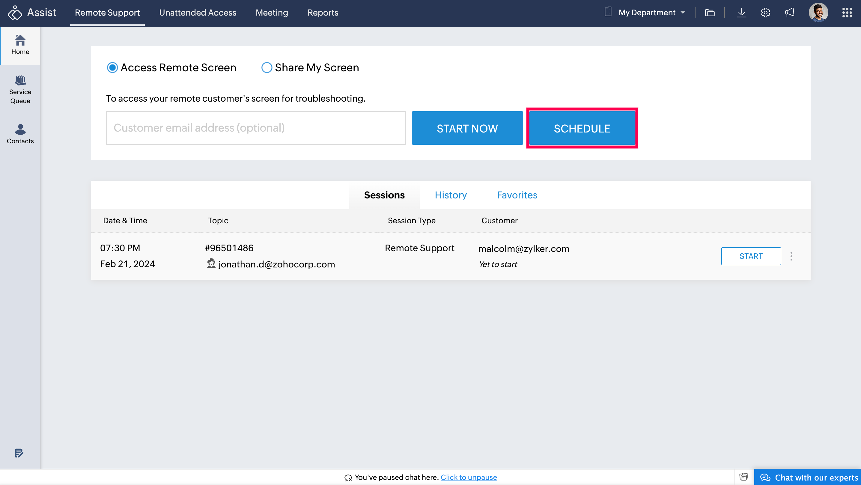 After logging in to your account, navigate to the Remote Support menu and click Schedule. Enter your customer's email, a title for the session, and a brief description. You can schedule based on the user's time zone or your own.