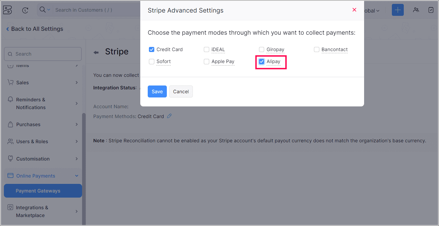 Alipay, a popular digital wallet in China, is now available as a payment method for Stripe payments in Zoho Inventory. With Alipay, you can securely make payments online. You can collect payments in Chinese Yuans from any location. Additionally, based on your Stripe account's location, you can receive payments in AUD, CAD, EUR, GBP, HKD, JPY, SGD, MYR, NZD, and USD.
