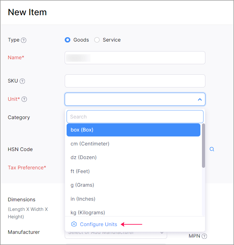 To access this option: Click Configure Units from the Unit dropdown in the Item creation or edit page.