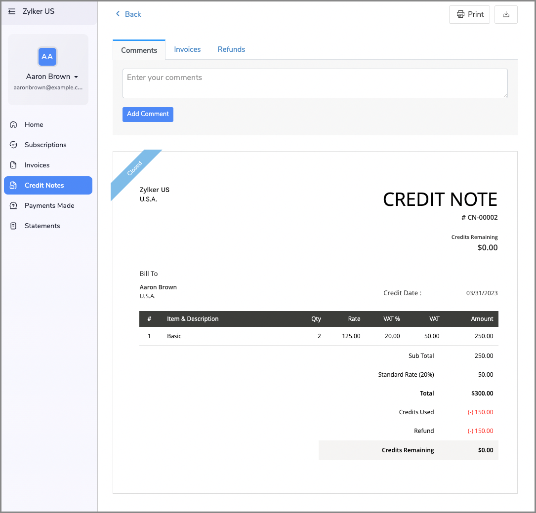 You can let your customers view and comment on their credit notes in the Customer Portal. They will also be able to view the invoices to which credits were applied. If a credit note was refunded, they will be able to check when the refund for that credit note was initiated, along with the amount and mode of payment.