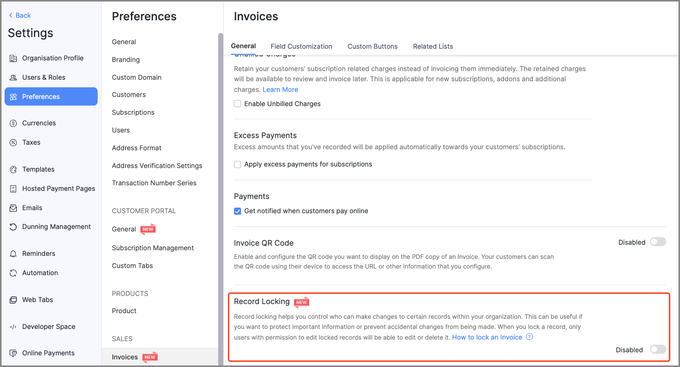 Before locking a record, you need to enable record locking for that module. To do this, go to the module's general preferences under Settings > Preferences and enable Record Locking. Now, you can head over to a particular record and lock it from the More dropdown.