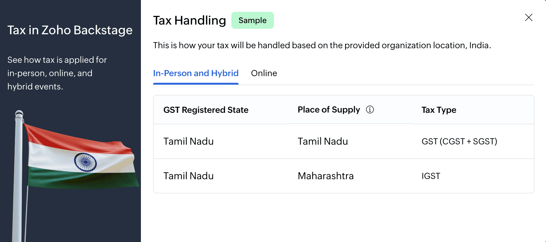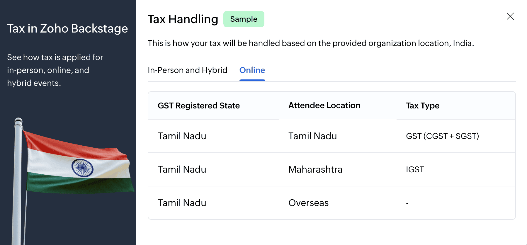 Businesses with turnover above the threshold limit of Rs.40 lakh or Rs.20 lakh or Rs.10 lakh as the case may be must register for GST and collect tax on event tickets. Zoho Backstage is not responsible or liable for collecting taxes. We recommend that you contact your local authority for advice on tax procedures or information regarding tax regulations. Tax invoice is in early access. Contact support for access.
