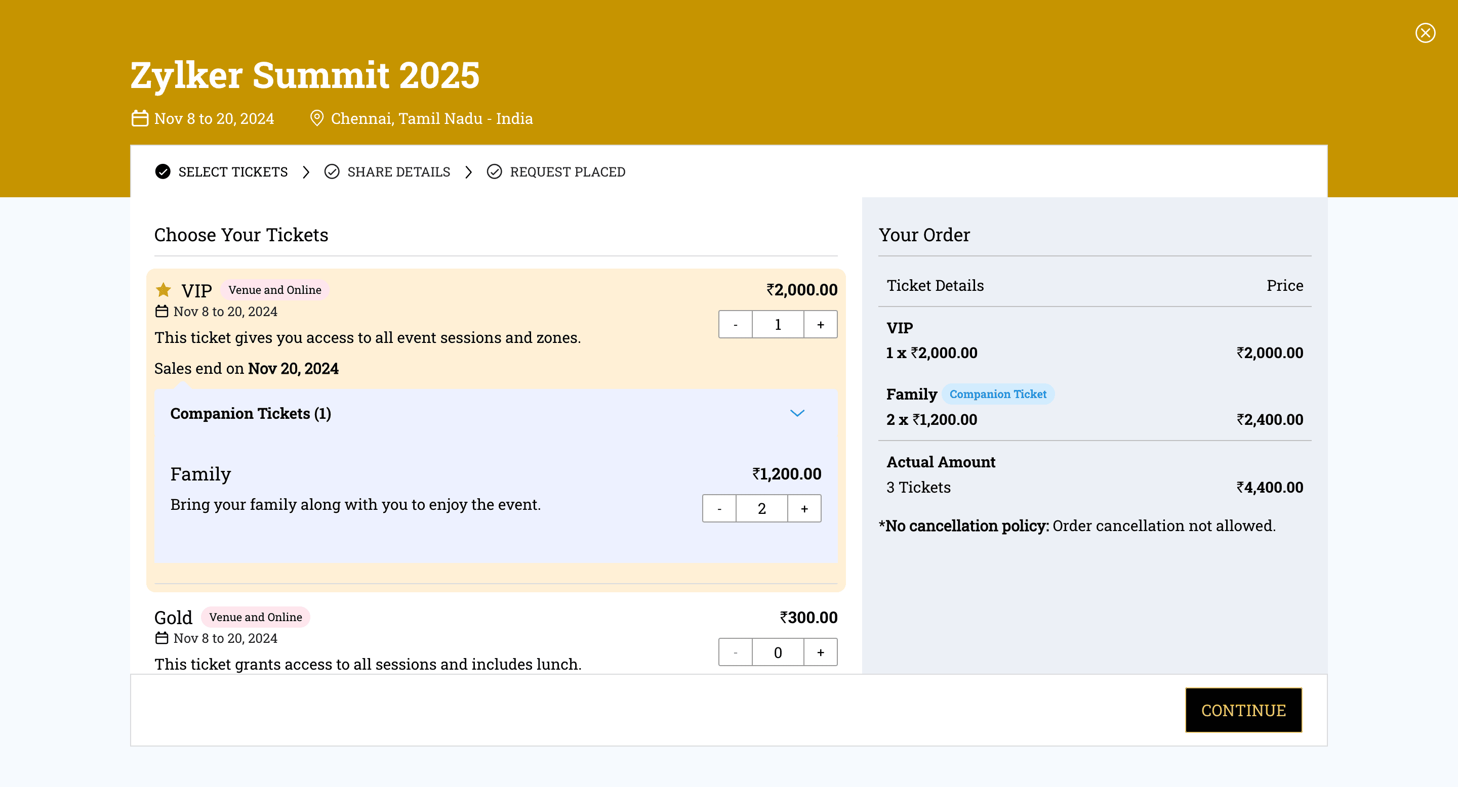 Event organizers can enable the Companion Tickets feature, which allows attendees to bring guests by purchasing secondary tickets linked to their primary ticket. Companion tickets can be selected only when the associated primary ticket is chosen during registration.