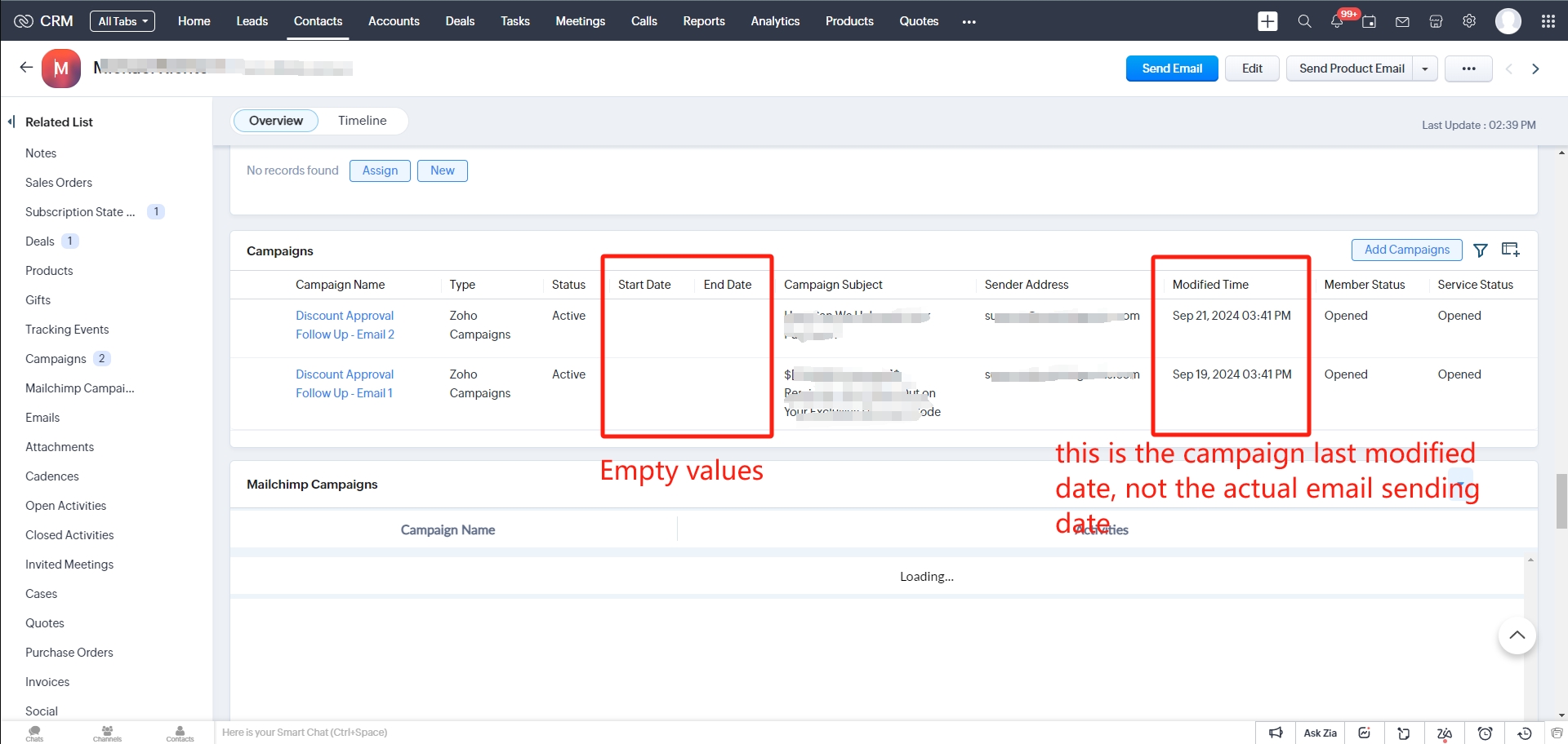 Zoho Campaigns Event timestamps do not propagate to Zoho CRM