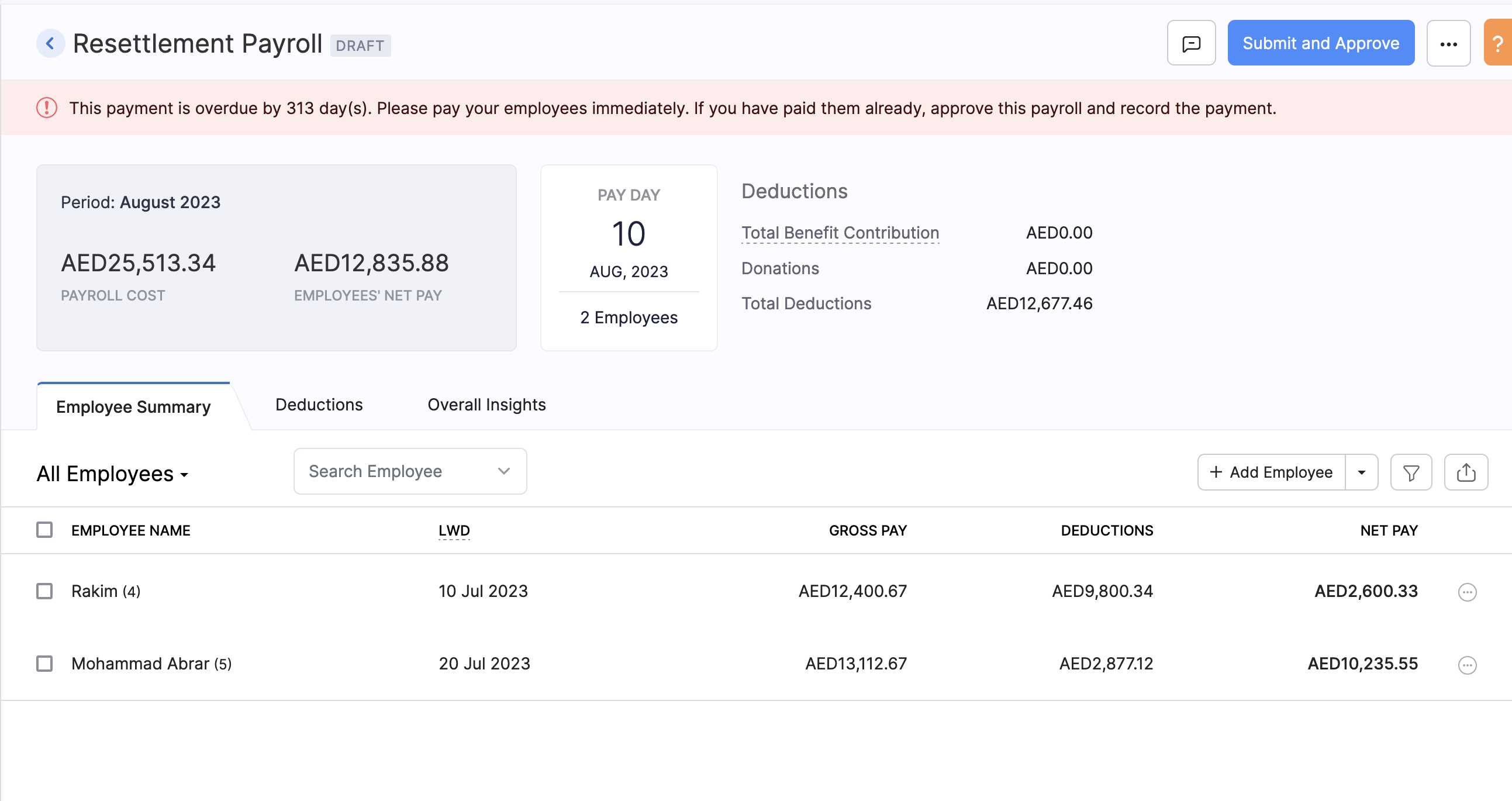 In certain situations, you might have processed the full and final settlement for employees who were exited from their positions without receiving their due compensation. With the Resettlement Payroll feature in Zoho Payroll, you can efficiently process payroll for exited employees who were not compensated at the time of termination without affecting the regular payroll.