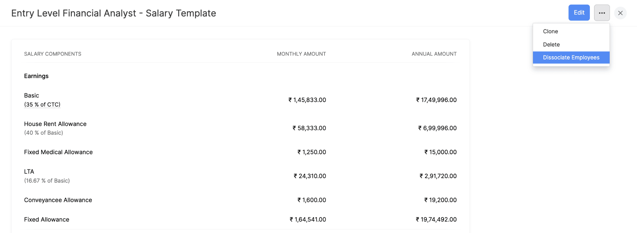 To Dissociate Employees: Go to Settings > Salary Templates. Select the template and click theMore icon. Click Dissociate Employees.