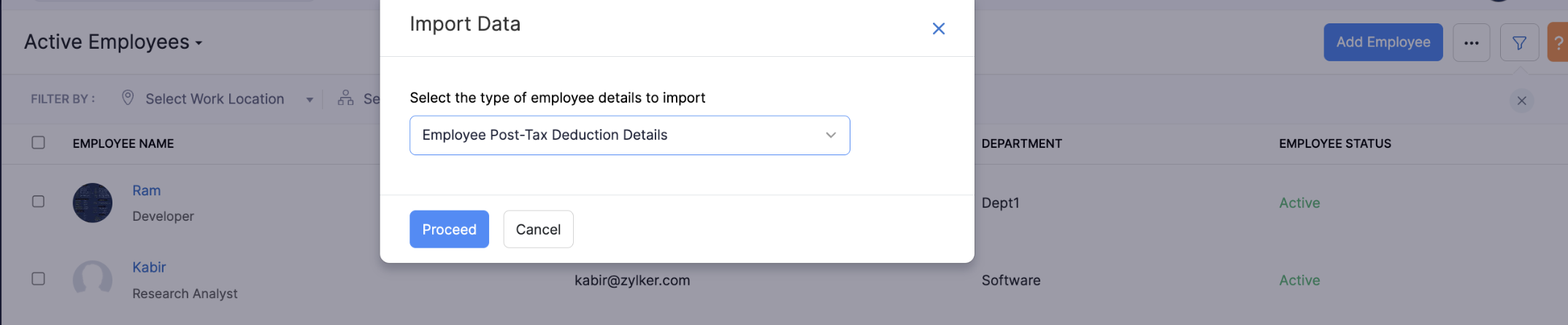 To Import Data: Go to Employees > Click the More icon > Import Data > Select Employee Post-Tax Deduction Details > Upload the file > Map the fields > Click Proceed.
