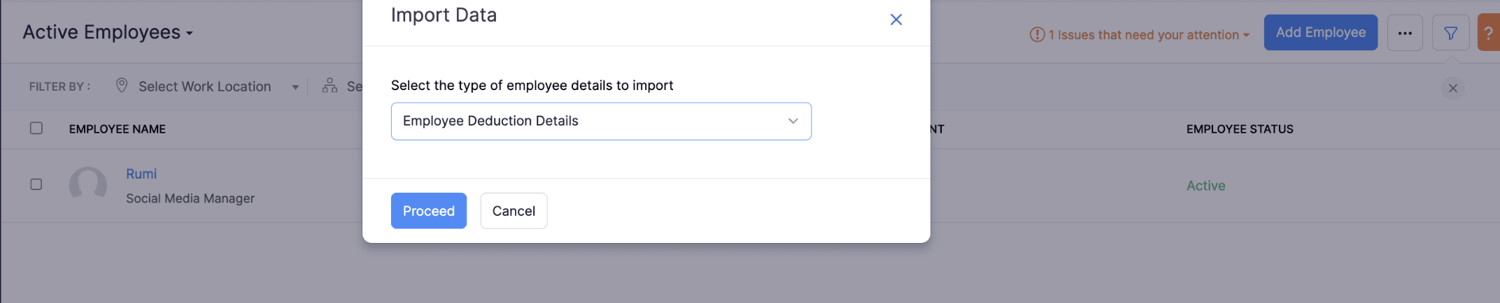 To Import Data: Go to Employees > Click the More icon > Import Data > Select Employee Deduction Details > Upload the file > Map the fields > Click Proceed.