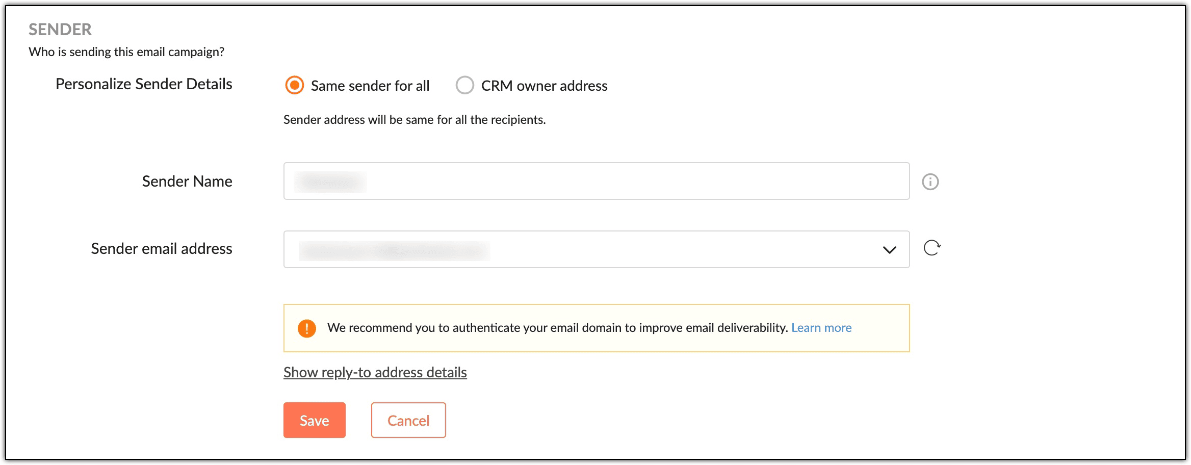 Personalizar Detalhes do Remetente: Você pode configurar os detalhes do remetente de suas campanhas de e-mail selecionando uma das seguintes opções: Mesmo remetente para todos, Com base em campo personalizado ou Endereço do proprietário do CRM.