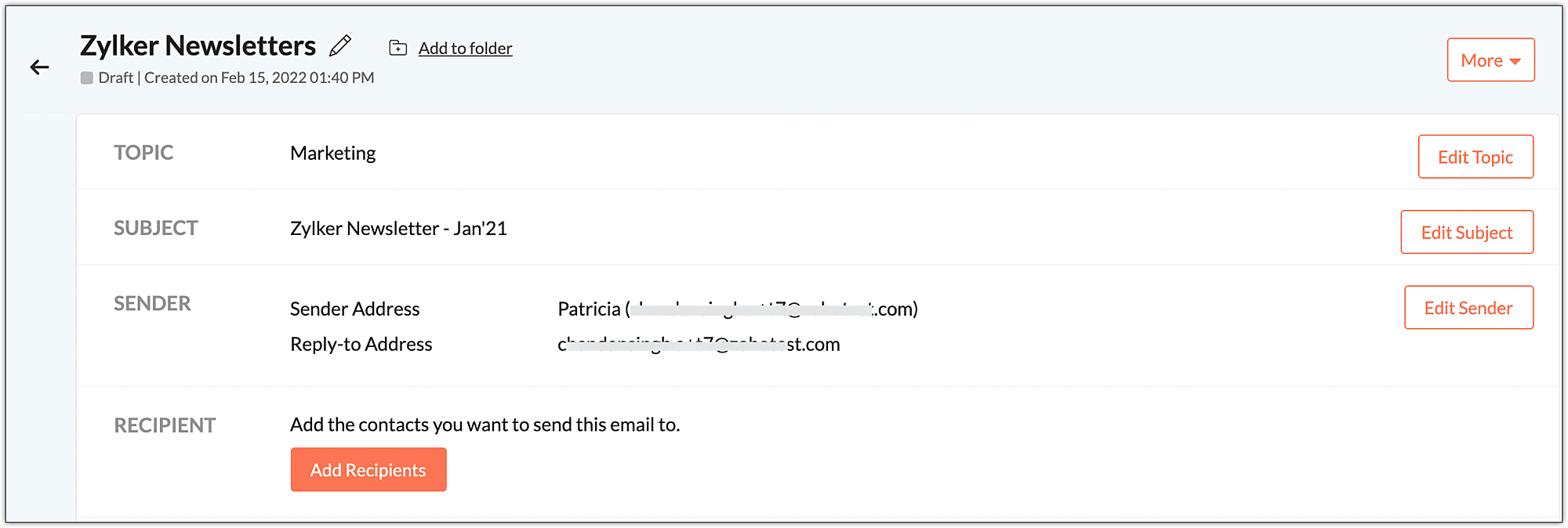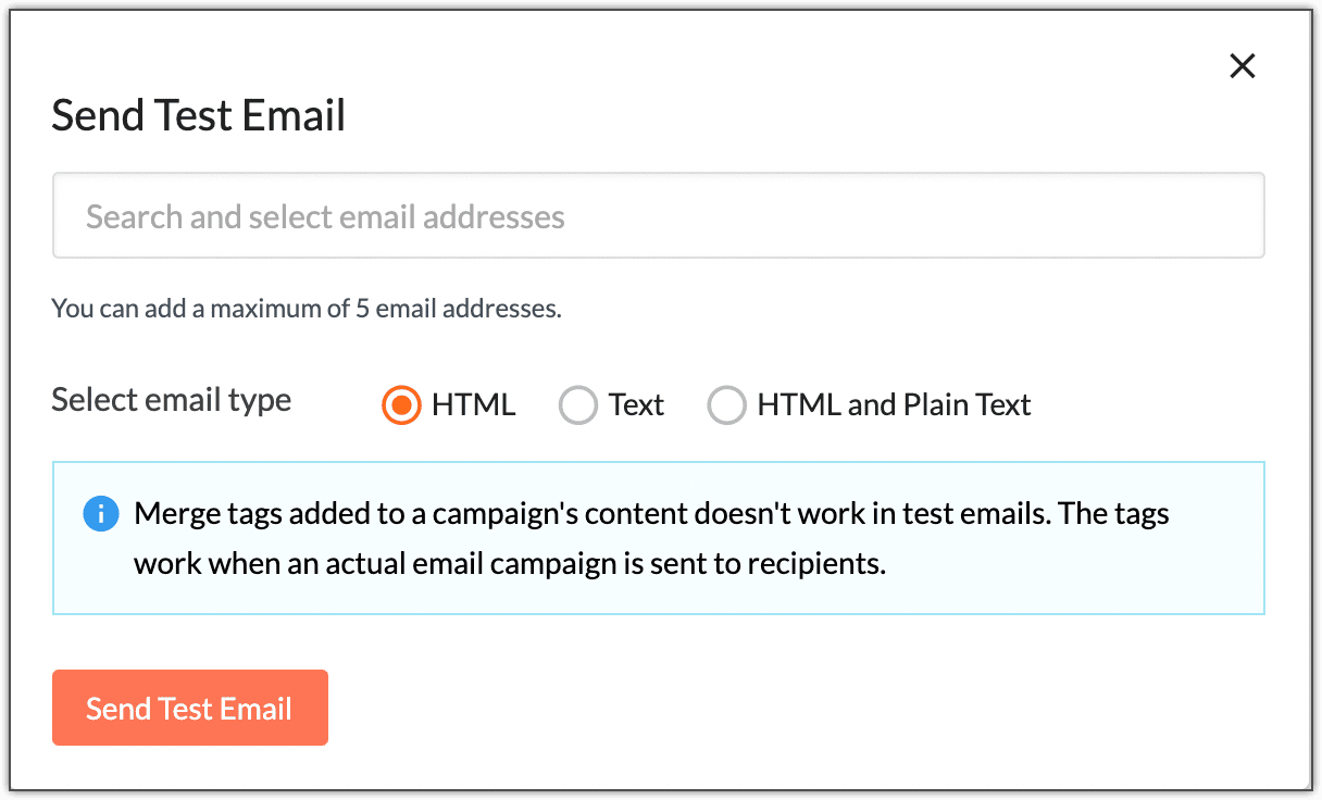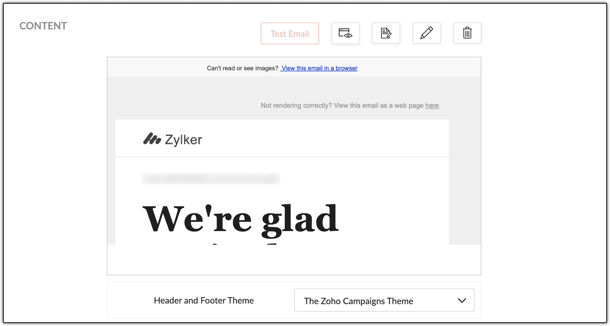 Peça a eles que revisem o e-mail, verifiquem erros gramaticais, problemas de alinhamento e testem os links para verificar se estão redirecionando para a página correta. É isso que o recurso de Pré-visualização e Teste no Zoho Campaigns ajudará você a fazer.