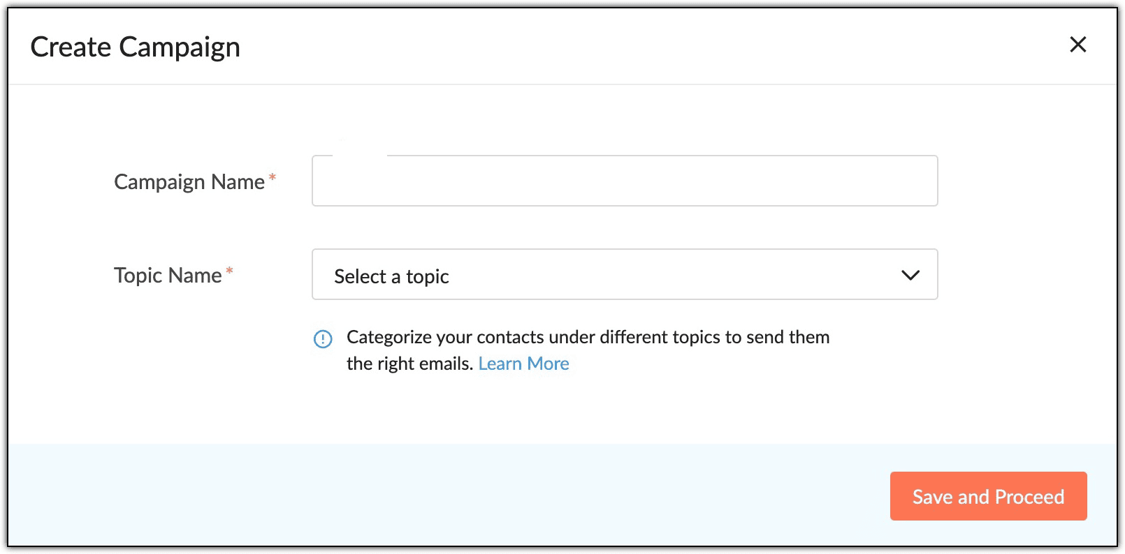 Agora, selecione o tópico atribuído aos contatos para os quais você deseja enviar a campanha de e-mail. Os tópicos no Zoho Campaigns permitem que seus contatos selecionem os assuntos sobre os quais desejam receber informações.
