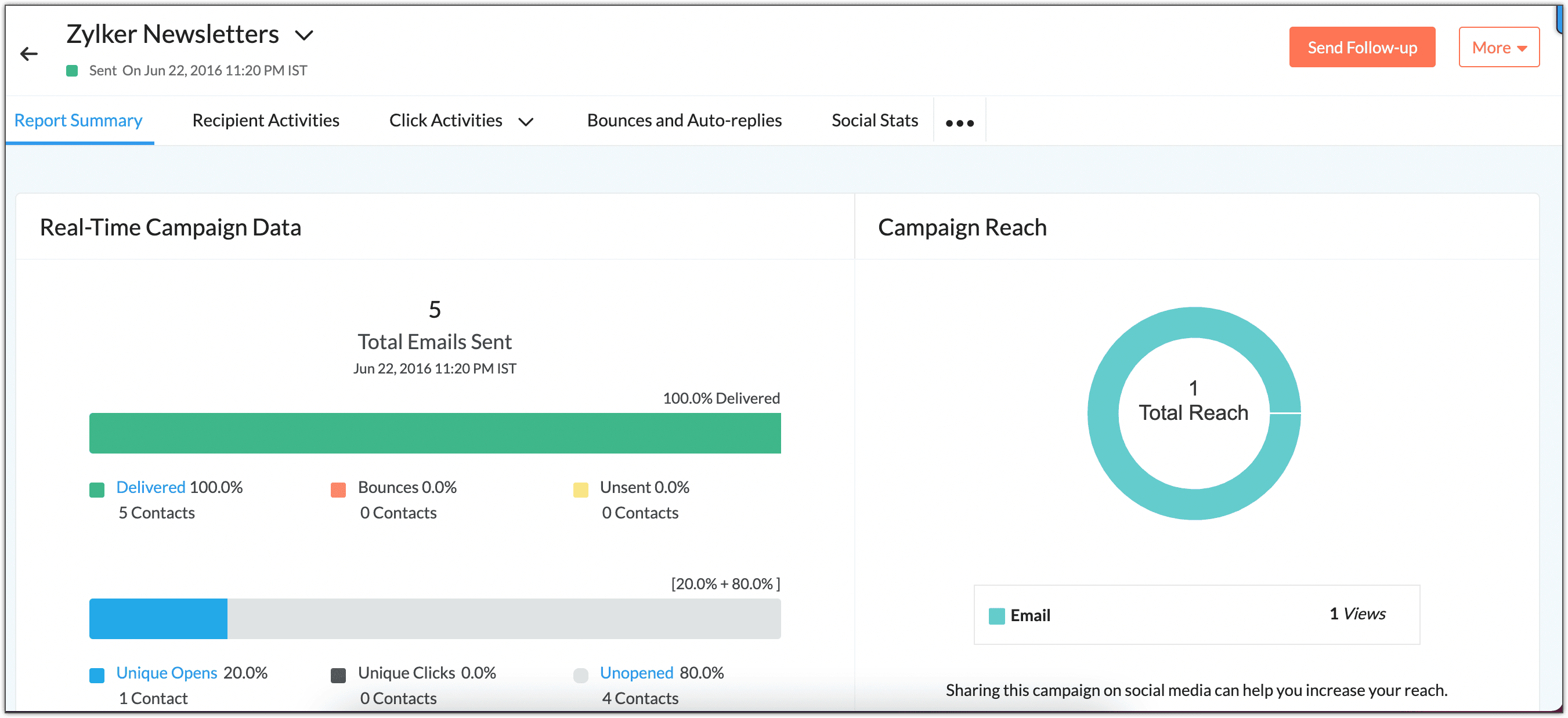 Você pode integrar sua conta do Zoho Campaigns com plataformas de mídia social como Facebook, Twitter, Tumblr e LinkedIn, e compartilhar suas campanhas com a comunidade online.