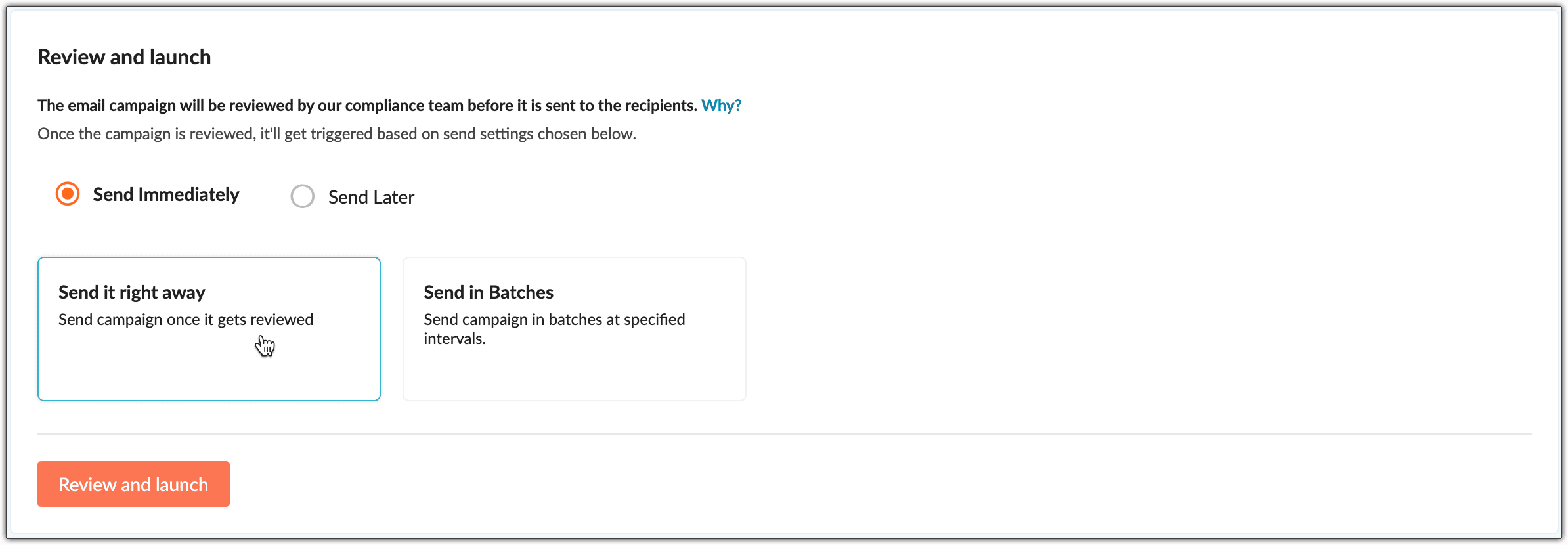 Antes de lançar sua campanha de e-mail, use a opção Revisar e Lançar para garantir que sua campanha de e-mail chegue à caixa de entrada do destinatário, e não à pasta de spam. Nossa equipe de conformidade verificará sua linha de assunto, lista de e-mails e conteúdo para conformidade com anti-spam.