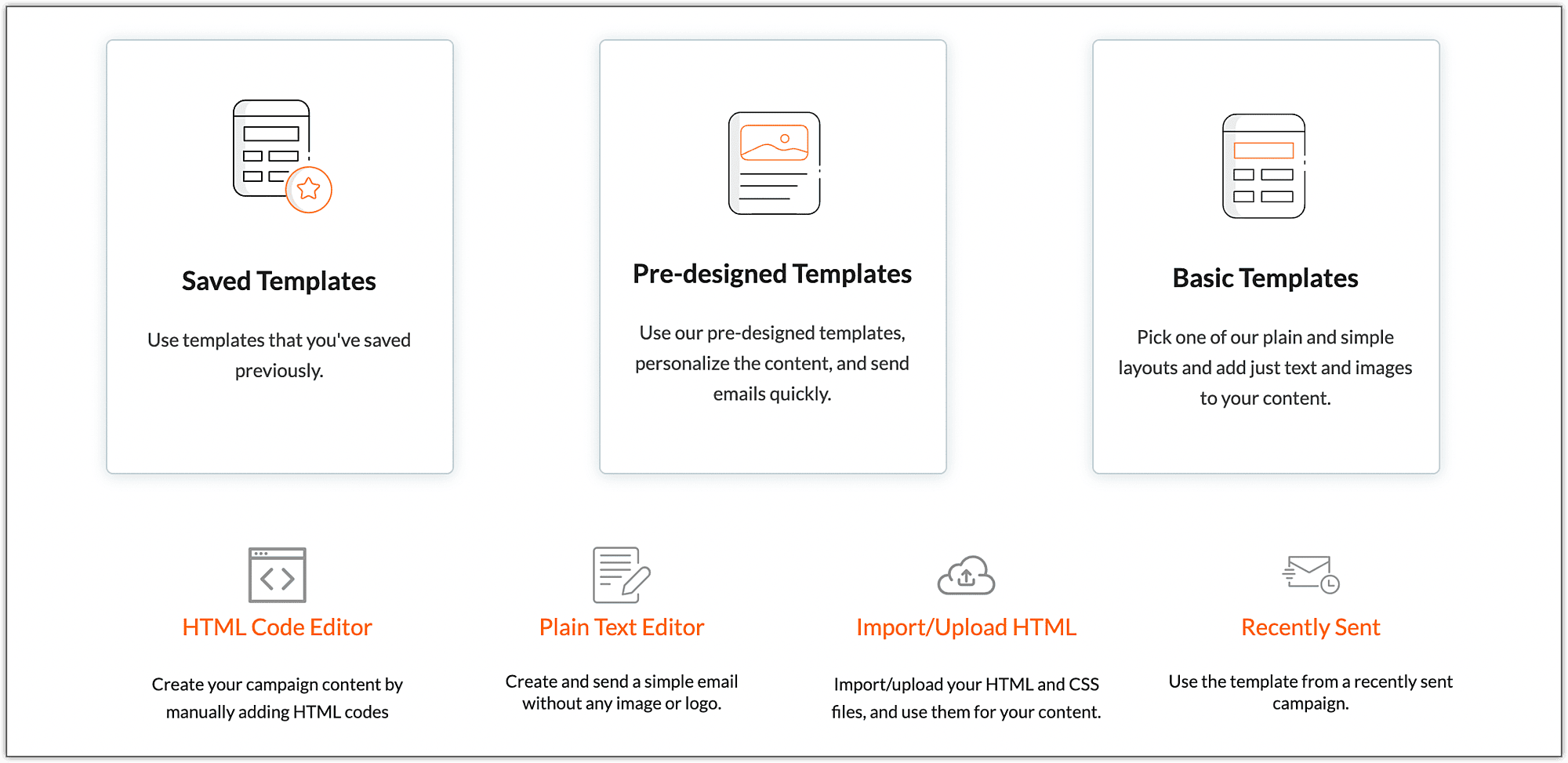 Zoho Campaigns fornece alguns modelos de email pré-desenhados para você usar. Basta escolher um modelo de email que atenda às suas necessidades e fazer algumas modificações para personalizá-lo de acordo com a voz da sua empresa.