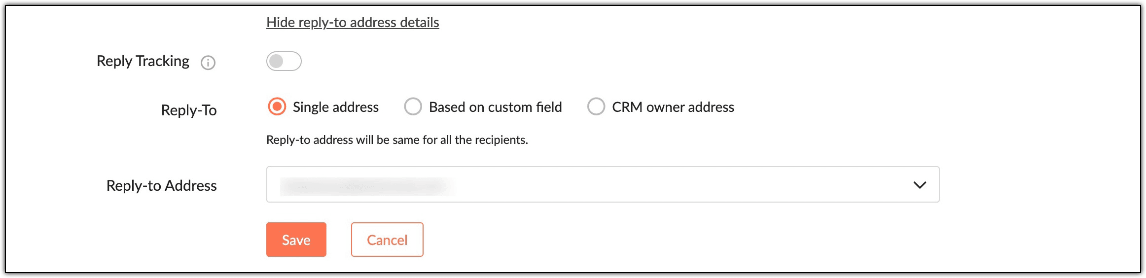 1. Responder Para - Esta seção ajudará você a coletar as respostas de seus contatos com base em uma das seguintes opções que você selecionar: Endereço único, Com base em campo personalizado e Endereço do proprietário do CRM (Se o destinatário foi importado do Zoho CRM, você pode personalizar o nome do remetente com base em qual usuário possui a conta no CRM).