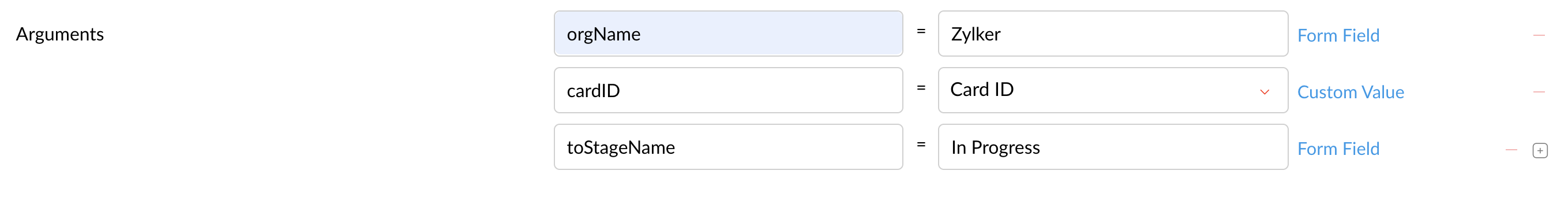 Primeiro, configure Argument Values (Valores de argumento) para todos os parâmetros usados na função personalizada. Você pode especificar um valor personalizado ou escolher um campo de formulário na lista suspensa. Os campos de formulário capturam valores dinâmicos de campos de cartão correspondentes à função personalizada.