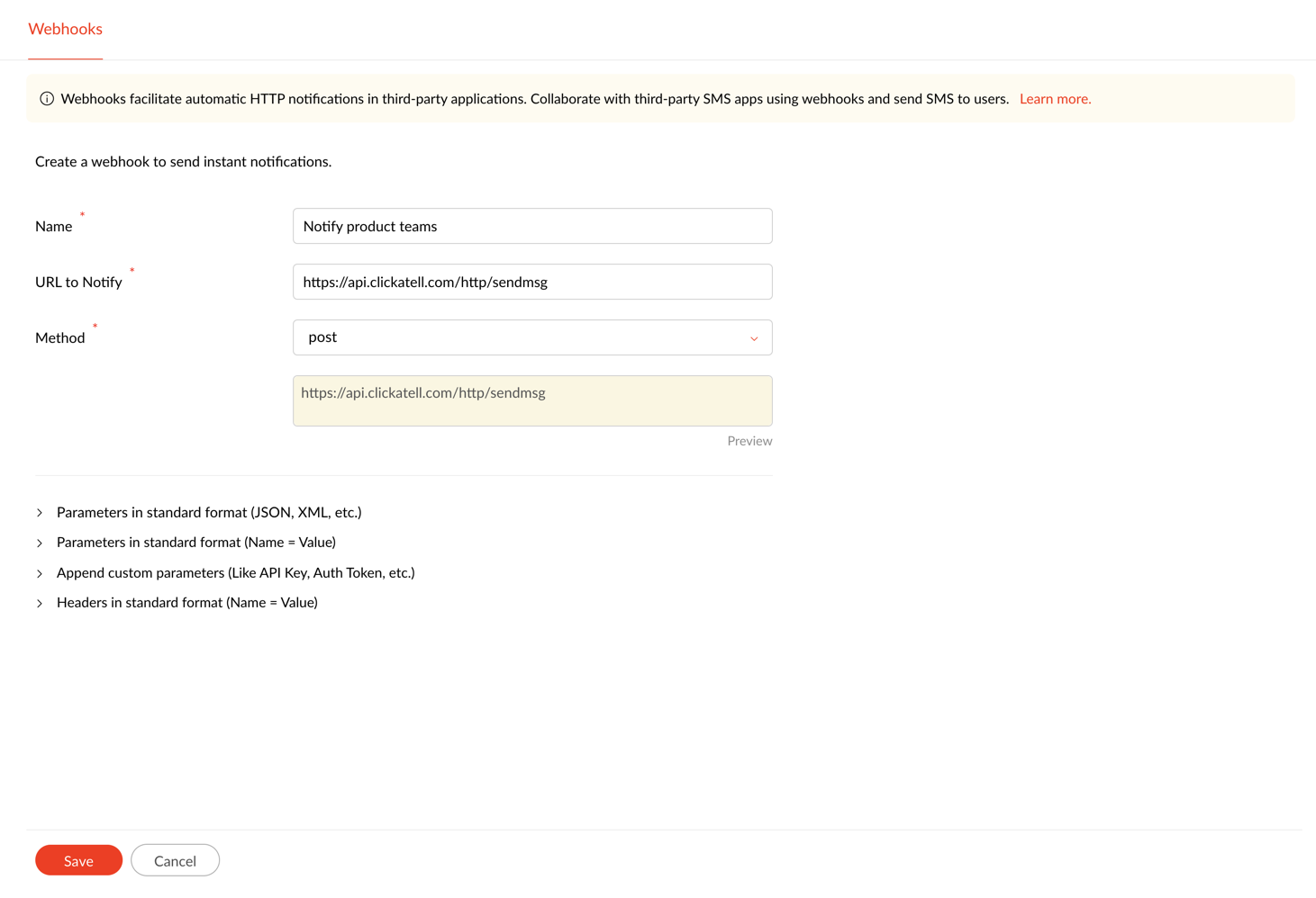 1. Especifique o nome do parâmetro e o seu valor correspondente para o webhook.